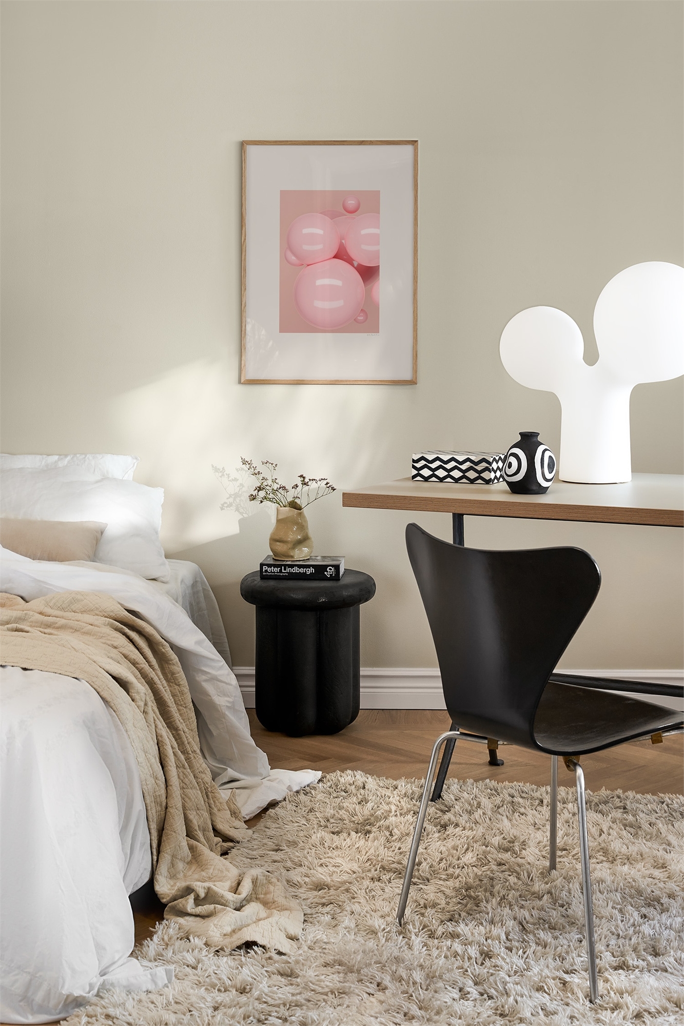 Глянцевые розовые шары, подвешенные в пространстве мягких тонов. Игривая, скульптурная композиция с сюрреалистическим оттенком. В обрамлении бледного паспарту, облегчающего общее восприятие.