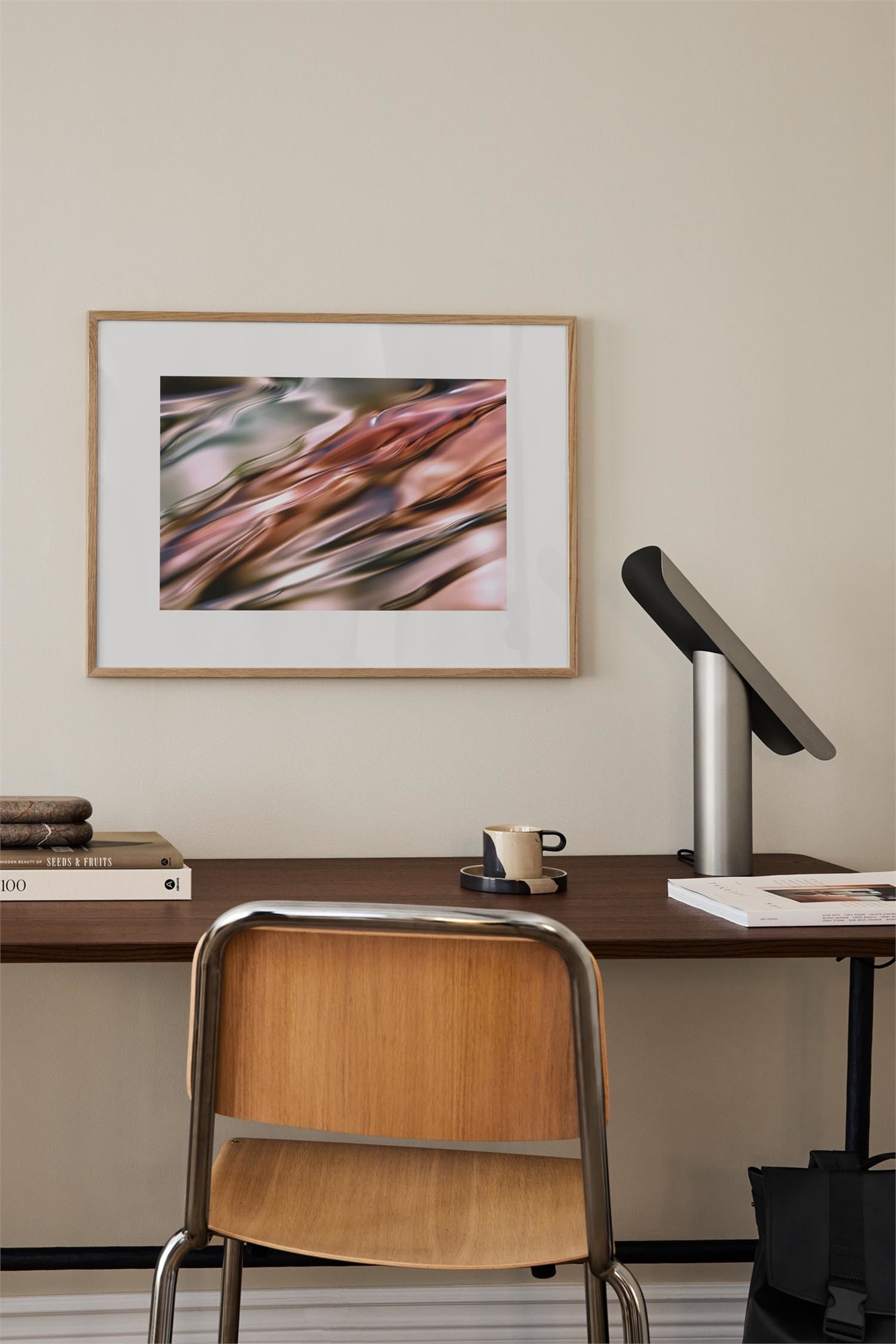 Волны мягкого металлического цвета проходят через раму с радужным блеском, переходящим от бронзового, румяного и бледно-зеленого. Текучая, мечтательная композиция, обрамленная легким паспарту.