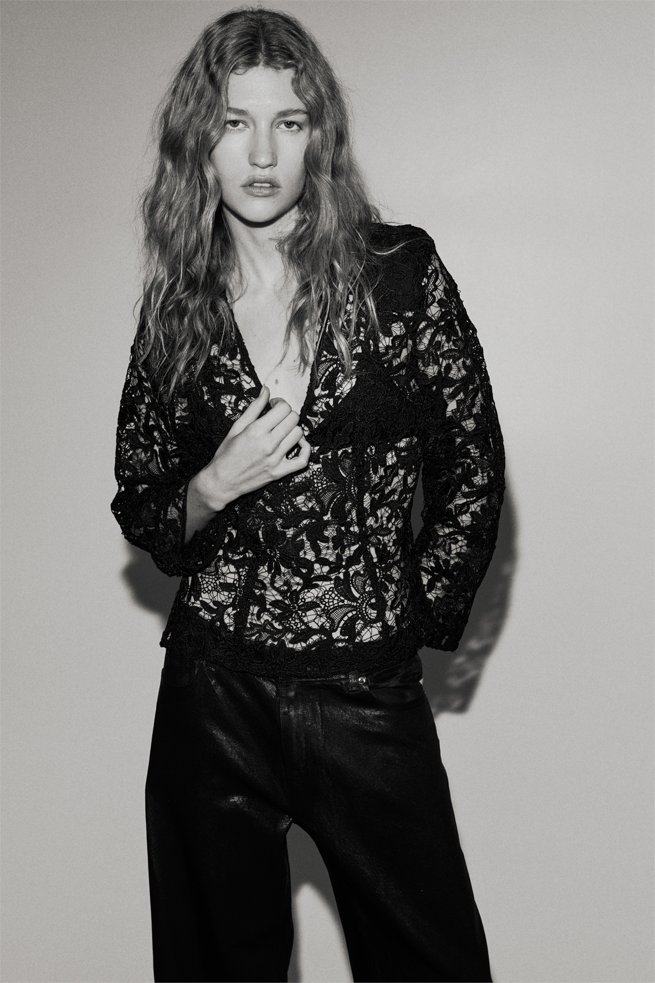 Сорочка с длинными рукавами из прозрачного кружева с V-образным вырезом и потайной застежкой-молнией сзади. Присборенная талия создает облегающий силуэт песочных часов. Верхняя часть на подкладке.