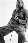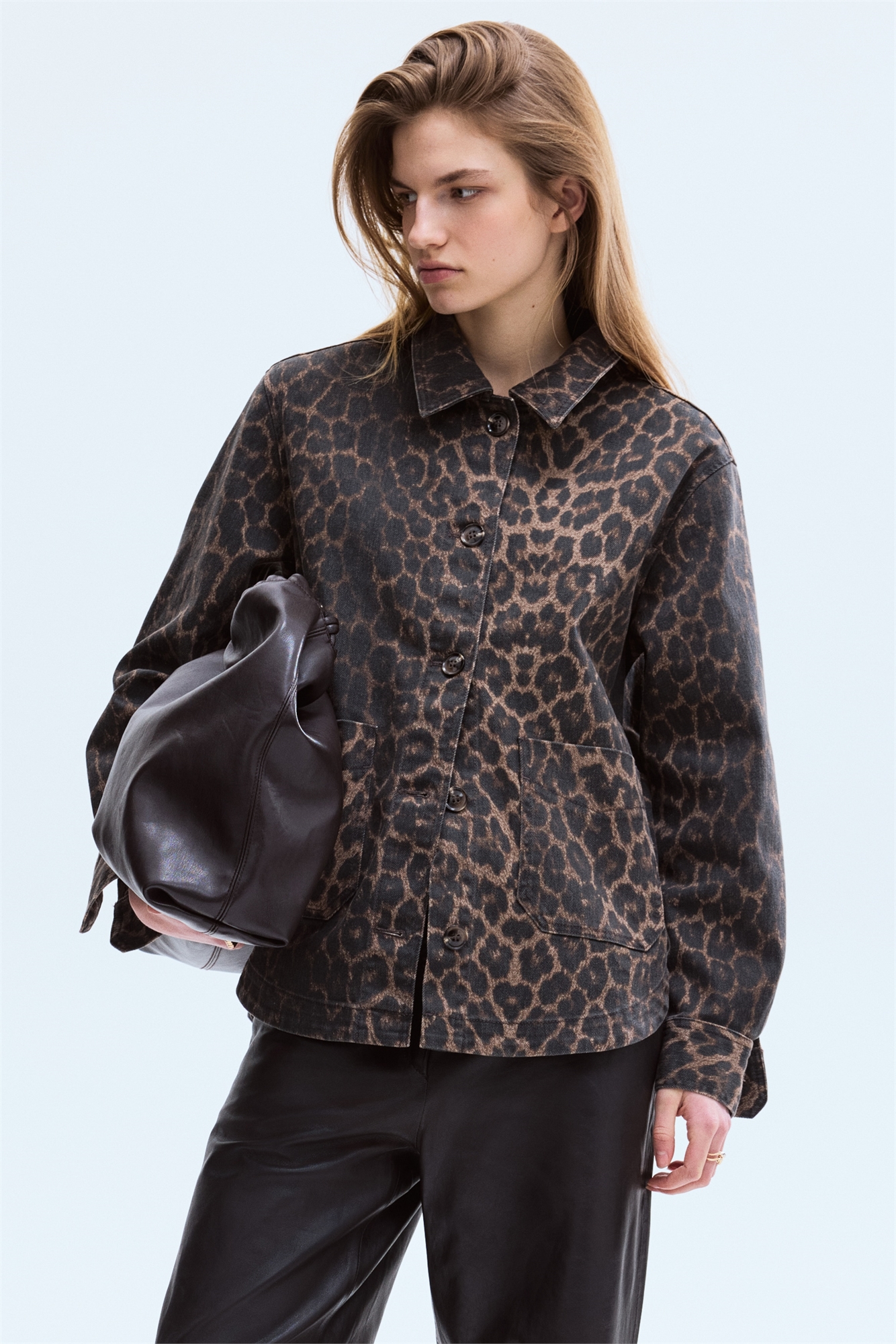 Рубашка из хлопковой саржи с воротником, пуговицами спереди и накладными передними карманами. Перевернутая складка сзади, спущенные плечи и длинные рукава с манжетами на пуговицах. Подол прямого кроя с закругленными боковыми вентиляционными отверстиями.
