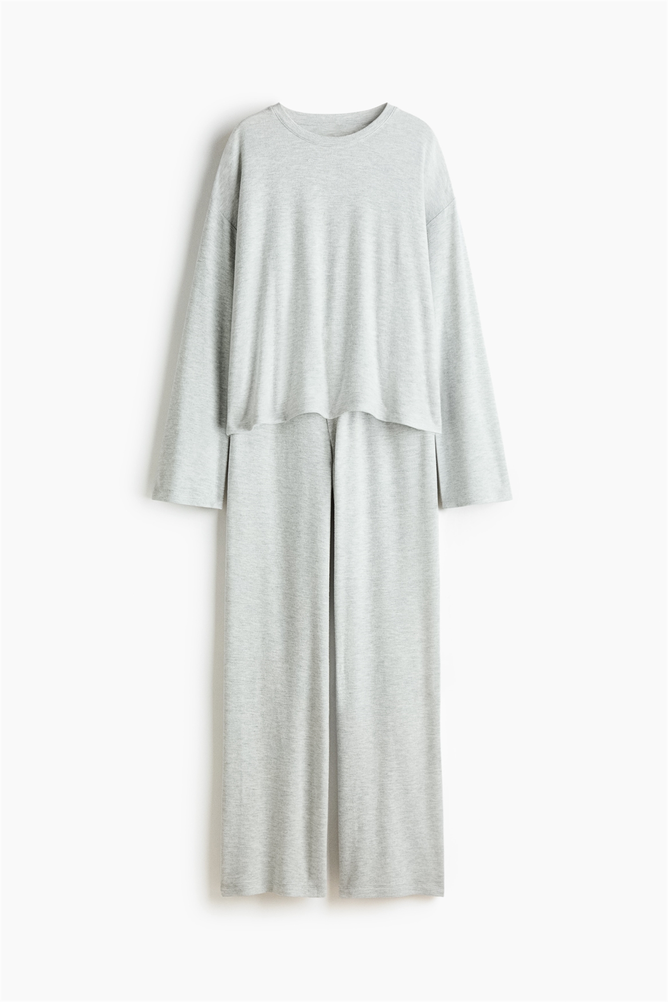 Пижама с верхом и низом из мягкого матового трикотажа. Топ с длинными рукавами, круглым вырезом и спущенными плечами. Низ с эластичной талией и фальшивой ширинкой с декоративными пуговицами.