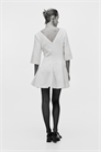 Короткое платье из ткани букле с круглым вырезом спереди, глубоким V-образным вырезом сзади и рукавами длиной 3/4. Накладные карманы с пуговицей спереди, потайная застежка на молнию и крючок-глаз сзади, расклешенная юбка. На подкладке.