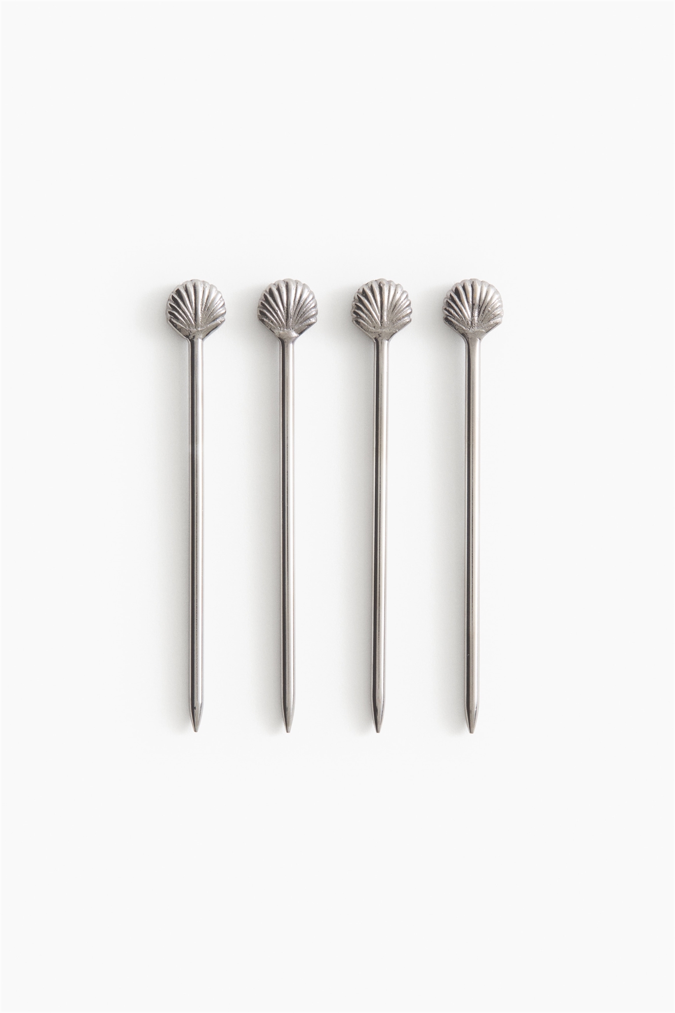 Коктейльные шпажки из нержавеющей стали с украшением в виде ракушки на верхушке и острым концом. Идеально подходят для украшения коктейлей или в качестве элегантного аксессуара для сервировки блюд.
