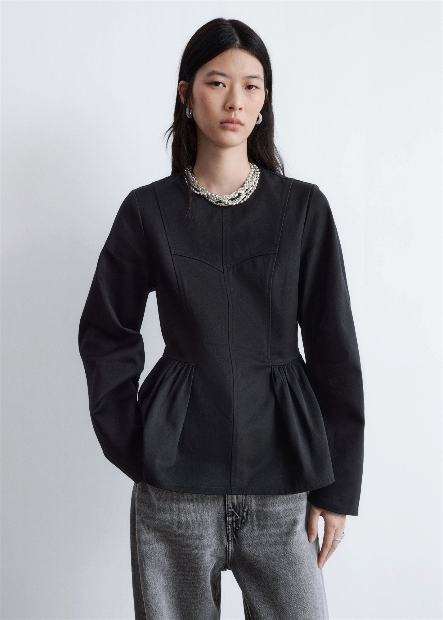 Этот топ из хлопкового полотна имеет женственный силуэт "пеплум", определяемый передним и задним швами, в том числе швом в форме сердца над бюстом. Он имеет круглый вырез, потайную застежку-молнию на спине и длинные рукава с вытачками по линии бедер для придания мягкой формы кокона. Регулярный крой Длина топа: 63,5 см / 25” (EU 38 / UK 10 / US 6)