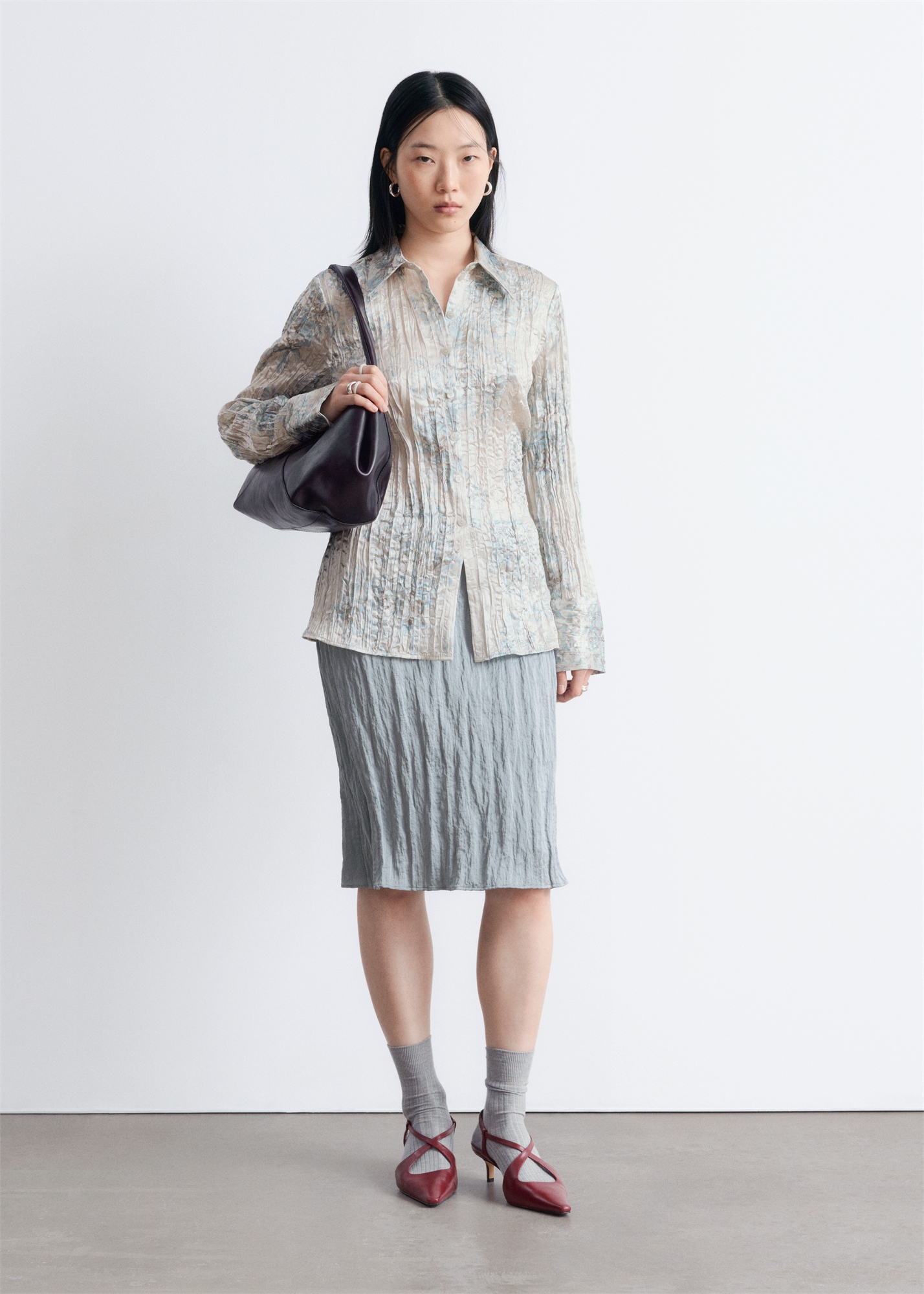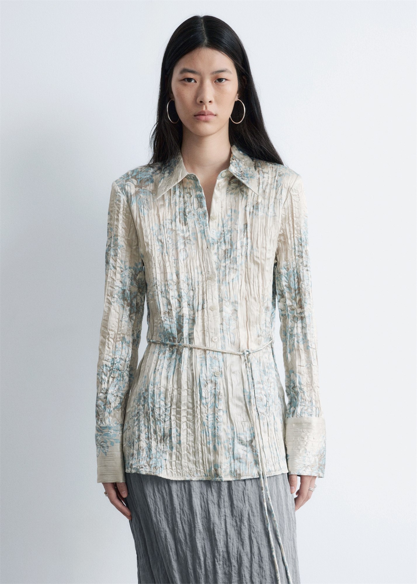 Эта рубашка из роскошного крепа-сатина с тонким цветочным узором имеет отложной воротник, застежку на пуговицах спереди и длинные рукава с разрезом на манжетах. Узкие завязки на талии завершают дизайн. Обычный крой Удлиненный крой