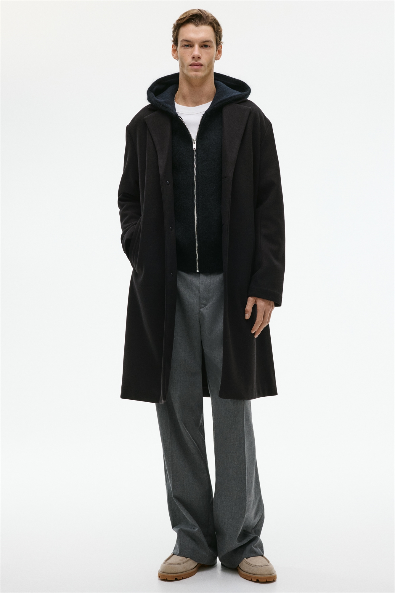 Однобортное пальто из войлока с добавлением шерсти, с лацканами с вырезом, пуговицами спереди и диагональными боковыми карманами. Подкладка на рукавах.