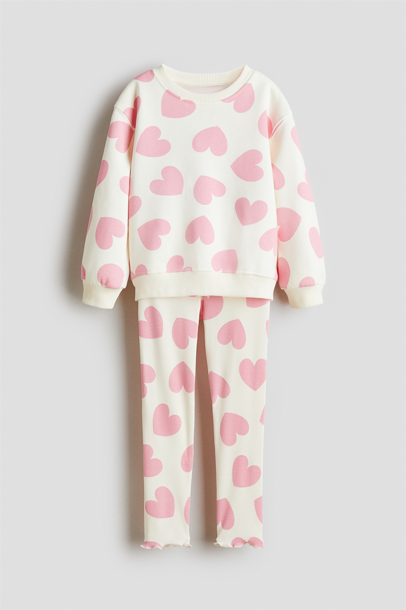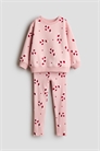 Комплект с принтом, состоящий из топа из толстовки с мягкой начесом внутри и леггинсов из ребристого хлопкового джерси. Топ с длинными рукавами, круглым вырезом с ребристой отделкой, спущенными плечами и окантовкой манжет и подола. Леггинсы с эластичной талией и оверлоком по подолу.