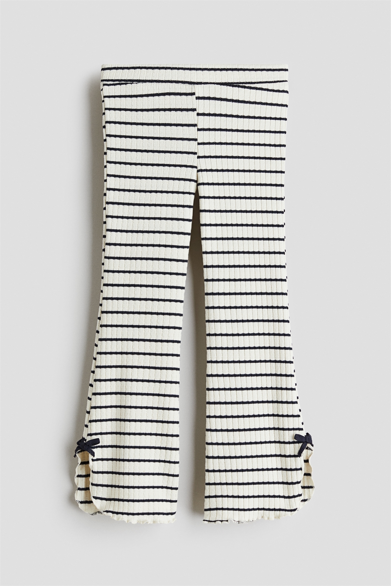 Леггинсы из мягкого трикотажа в рубчик. Скрытая эластичная резинка на талии и расклешенные ноги с разрезом и декоративным бантом по бокам на подоле.