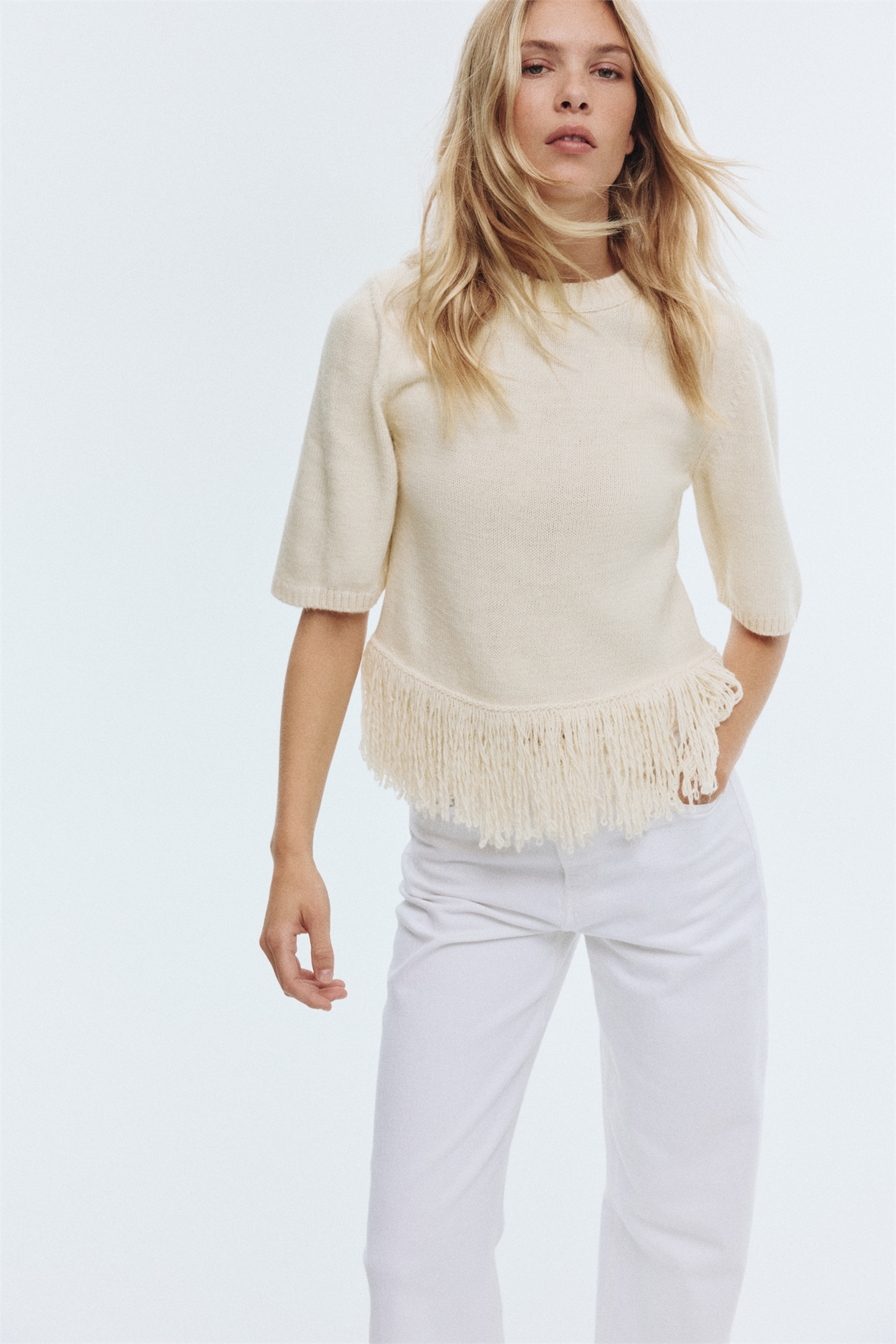 Короткий приталенный джемпер из мягкого трикотажа с ребристой горловиной, короткими рукавами с рубчиком на манжетах и прямым подолом с длинной бахромой.