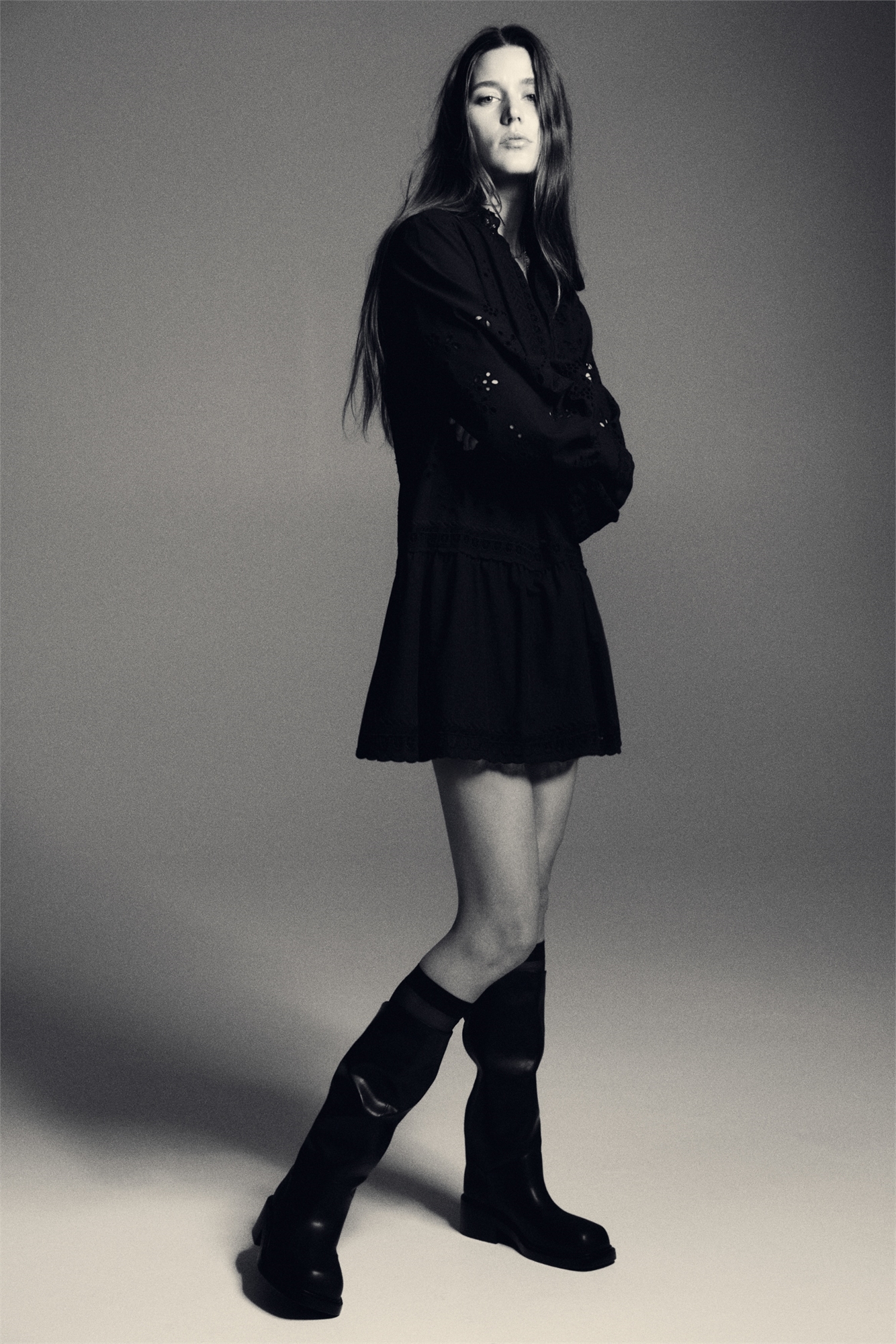 Короткое платье из хлопчатобумажного полотна с отделкой из английской бродери. Оборчатый воротник, разрез спереди и длинные рукава-баллон с разрезом и пуговицей на манжетах. Присборенный шов на бедрах, мягко расклешенный подол. Частично на подкладке.