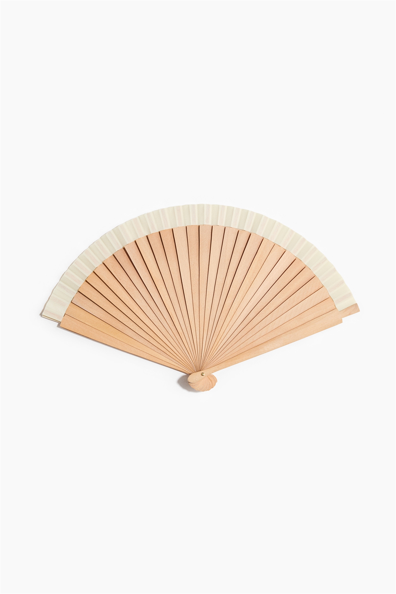 Складной веер из дерева с тканевой окантовкой по верхнему краю и металлической заклепкой внизу.