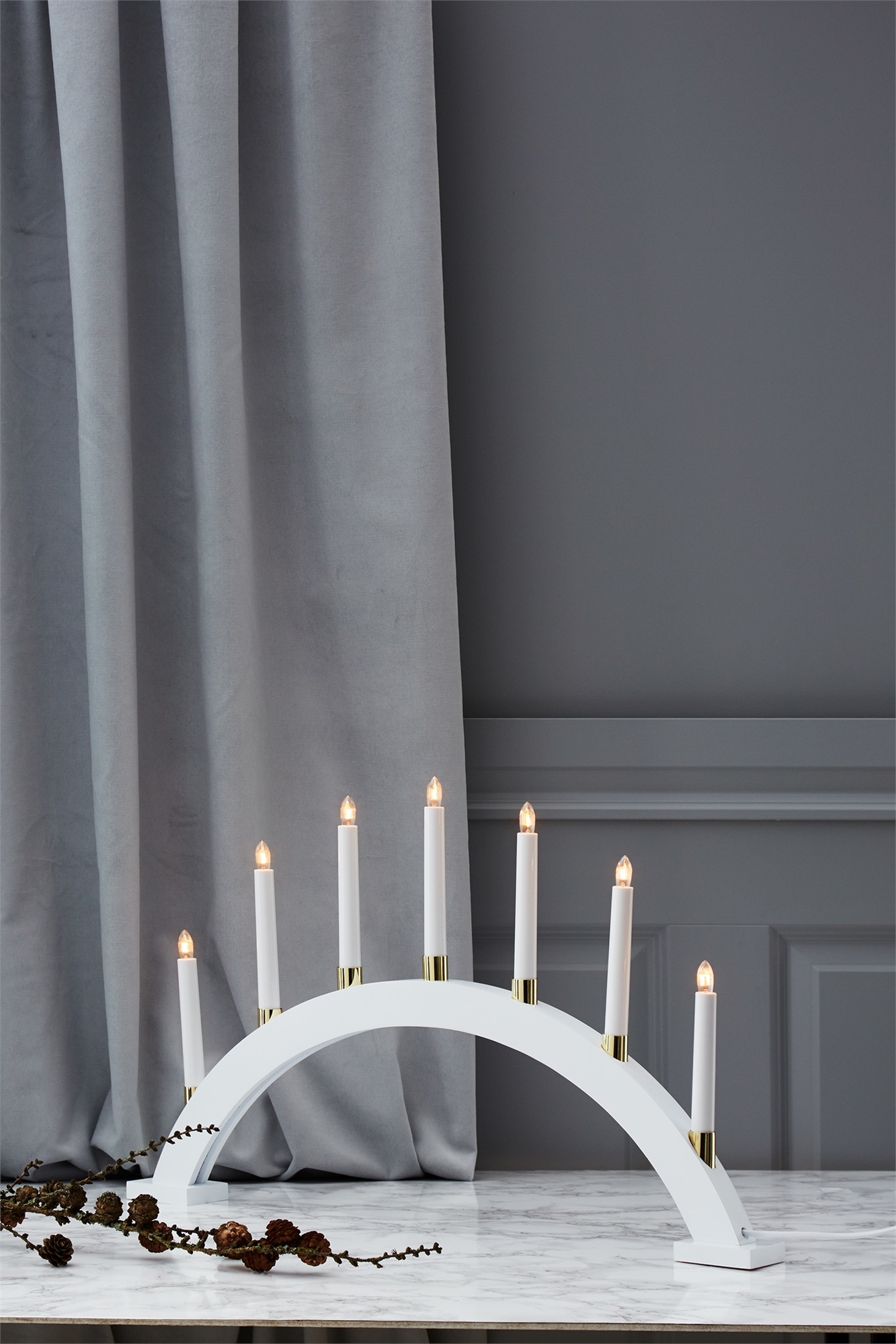 Деревянный подсвечник в форме арки с 7 латунными держателями свечей. Симпатичный адвентский канделябр излучает рождественское настроение. Ширина: 63 см. Высота: 40 см. Продукт со знаком FSC®.
