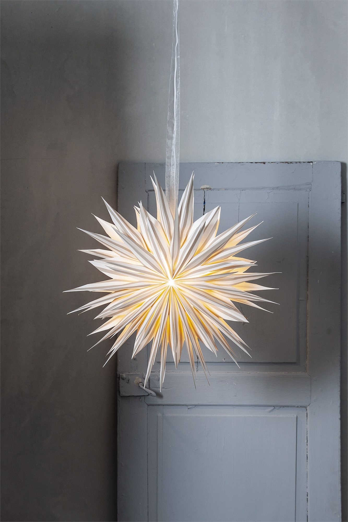 Декоративная звезда, сложенная из трех слоев бумаги. С полосатым принтом в цвете беж/слон. Зауженный силуэт создает зимний образ. Элегантная ленточка позволяет легко подвесить ее. Эта адвент-звезда добавит волшебную рождественскую атмосферу в любой дом. Прекрасно подойдет для украшения окна или стены. Без подвеса. Продукт со знаком FSC®.