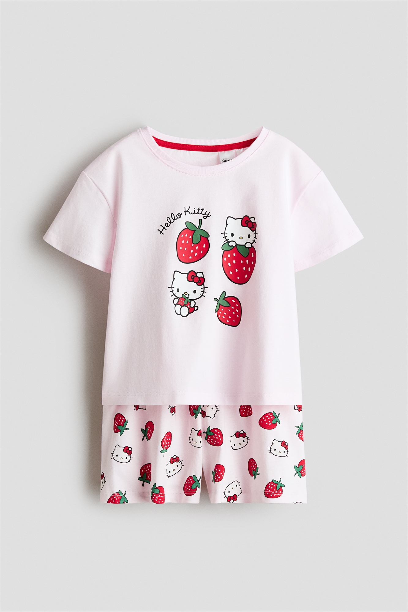 Пижама из мягкого хлопкового джерси с принтом, состоящая из футболки и шорт в тон. Футболка с ребристой отделкой вокруг выреза и слегка заниженными плечами. Шорты с эластичным поясом, отделанным оборкой.