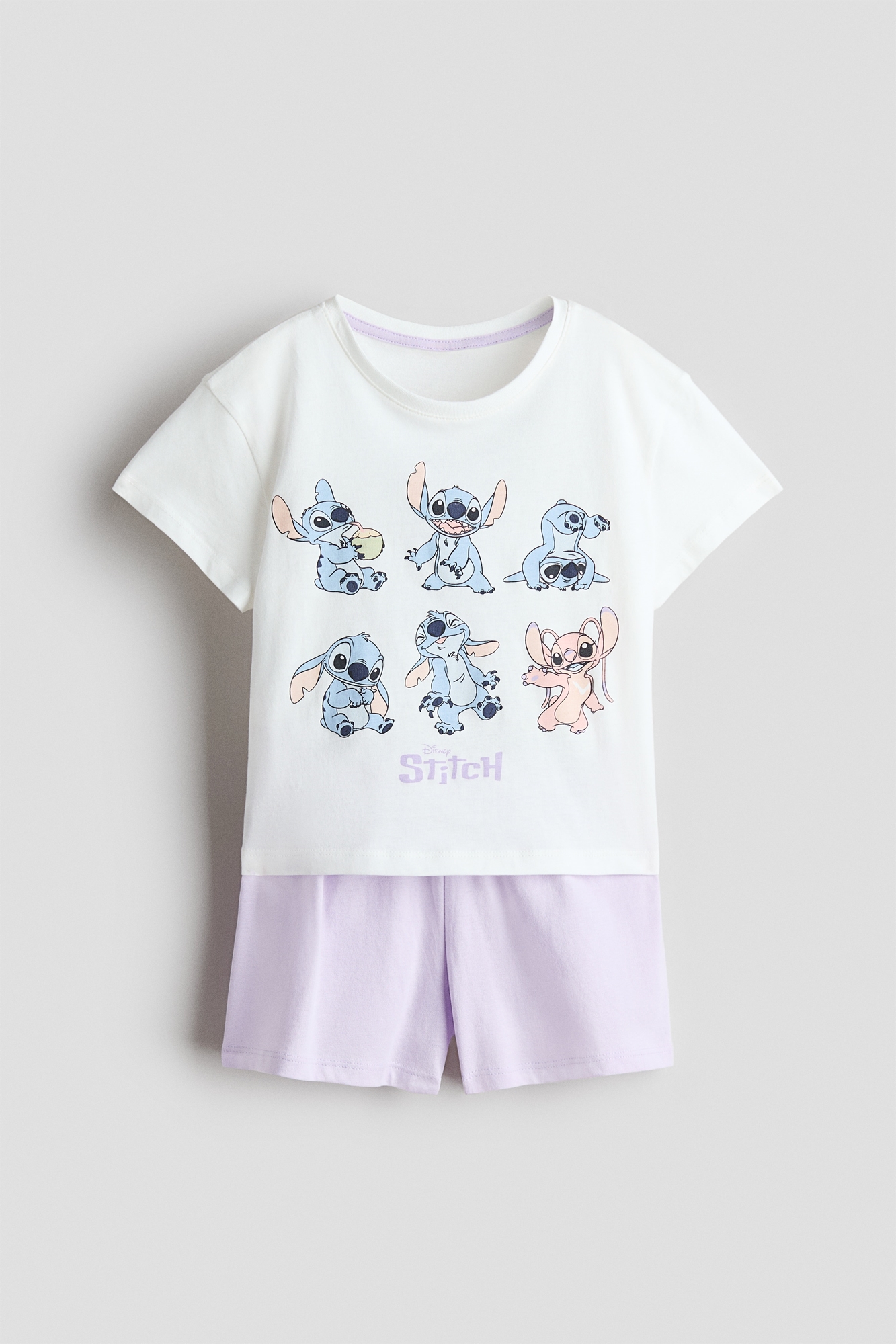 Пижама из мягкого хлопкового джерси с принтом, состоящая из футболки и шорт в тон. Футболка с ребристой отделкой вокруг выреза и слегка заниженными плечами. Шорты с эластичным поясом, отделанным оборкой.