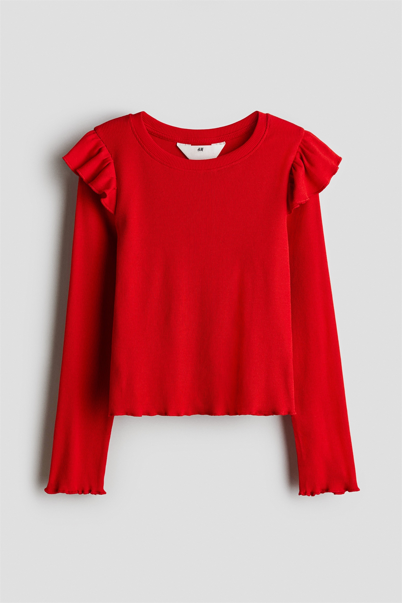 Топ из мягкого ребристого хлопкового джерси с круглым вырезом, длинными рукавами и оборкой на плечах.