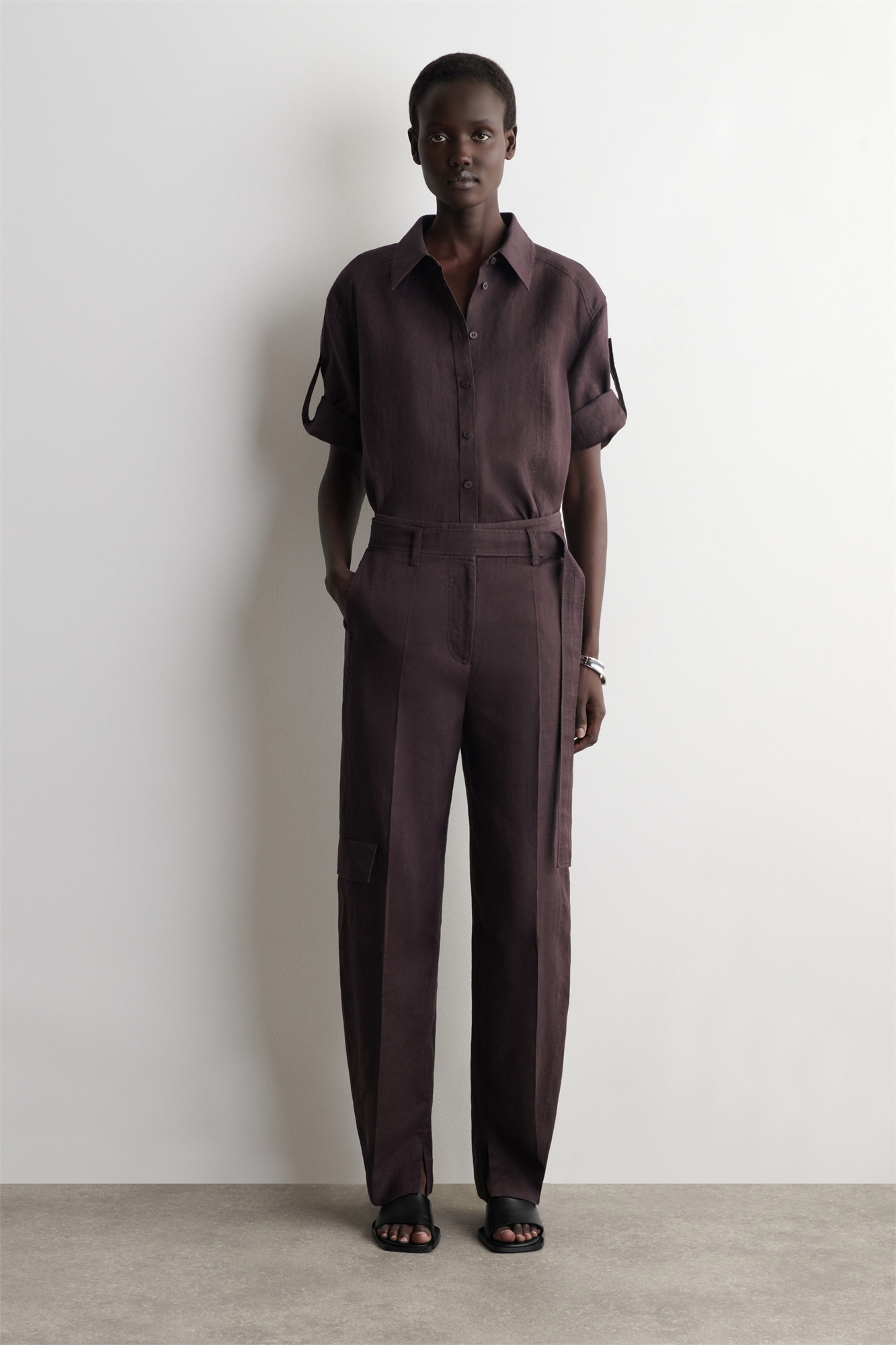 Эти современные брюки из легкого, приятного на ощупь льна представляют собой минималистичную интерпретацию утилитарного дизайна. Модель с широкими брючинами имеет длинный пояс, карманы, вдохновленные рабочей одеждой, и разрезы на лодыжках. Нормальный крой. Крючок, застежка-молния и молния. Машинная стирка. Длина по внутреннему шву в размере EU 36 = 74,8 см. Модель носит размер EU 36.