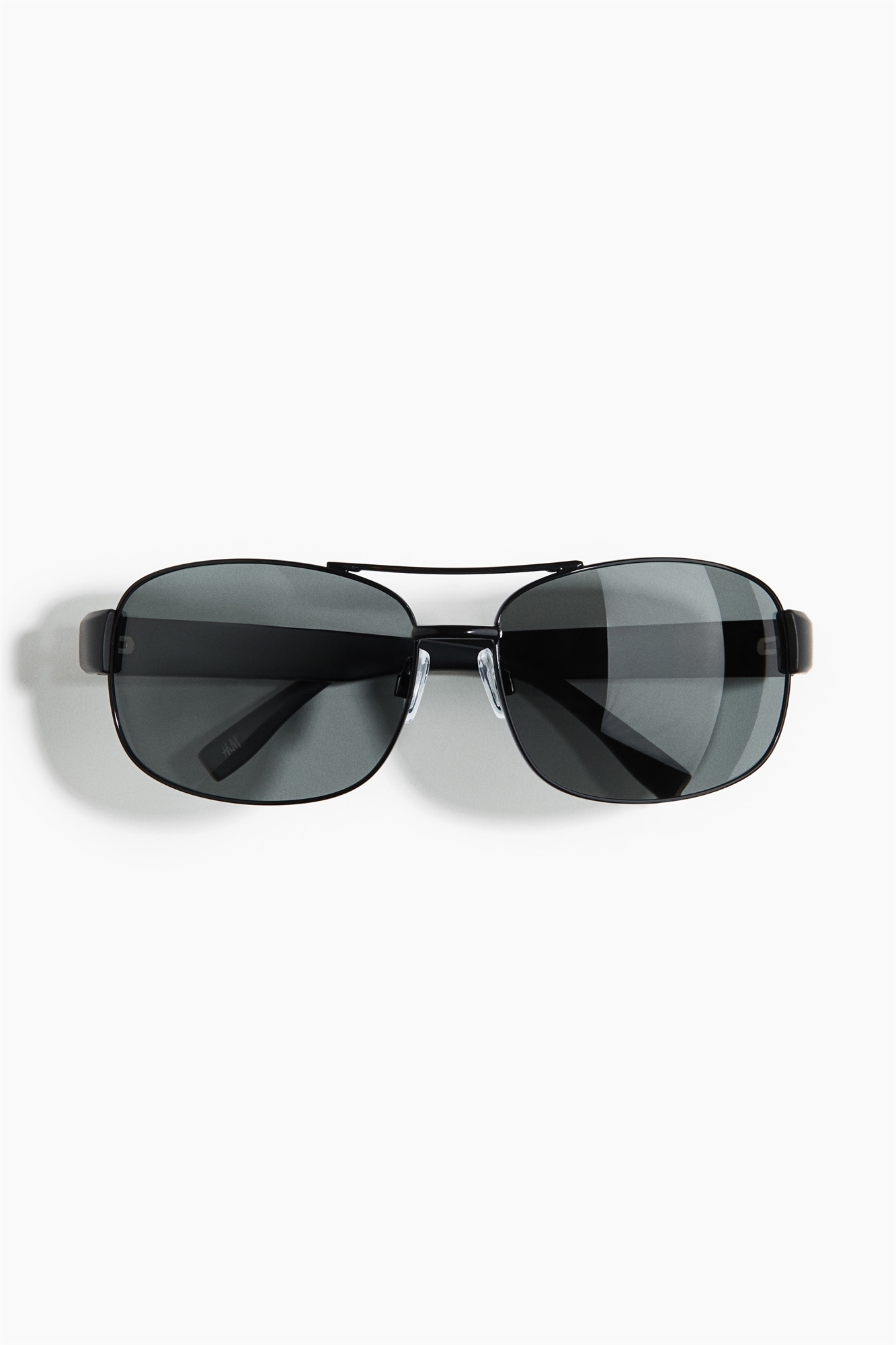 Солнцезащитные очки с пластиковой и металлической оправой и тонированными линзами из пластика с защитой от ультрафиолета.