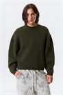 Плотный свитер из мягкой хлопковой пряжи. Он имеет вырез горловины, спущенные плечи и ребристую отделку по горловине, манжетам и подолу.