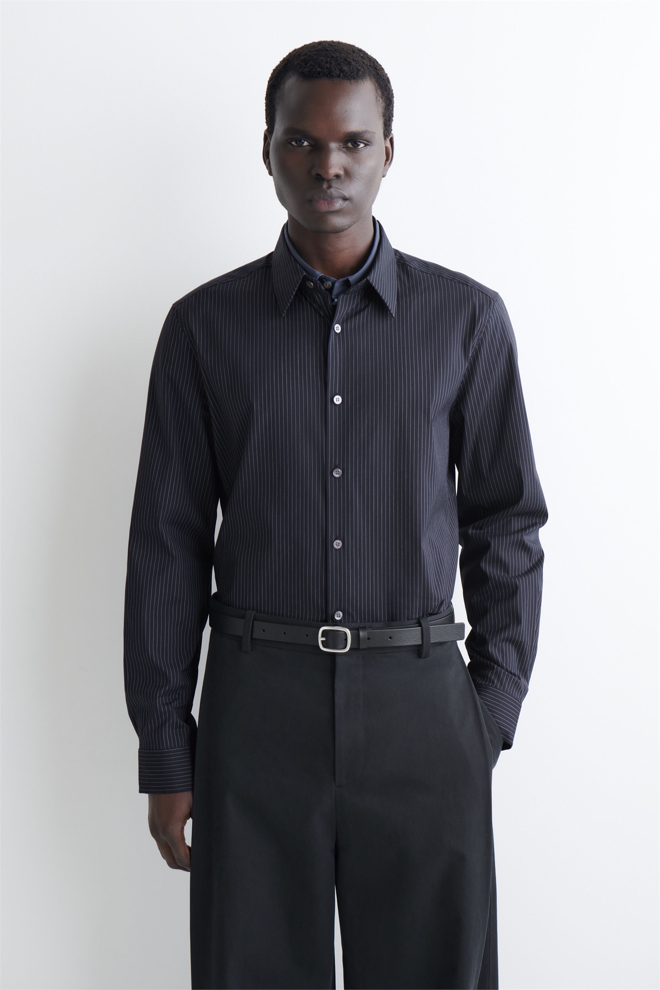 Классическая рубашка из поплина — основа любой коллекции одежды. Эта модель с зауженным кроем имеет заостренный воротник, перламутровые пуговицы и длинные рукава с манжетами. Универсальный темно-синий цвет и тонкие полоски хорошо сочетаются с костюмом или чиносами. Зауженный крой Застежка на пуговицах Машинная стирка Длина спинки размера EU 39 составляет 79 см / Модель носит размер EU 39