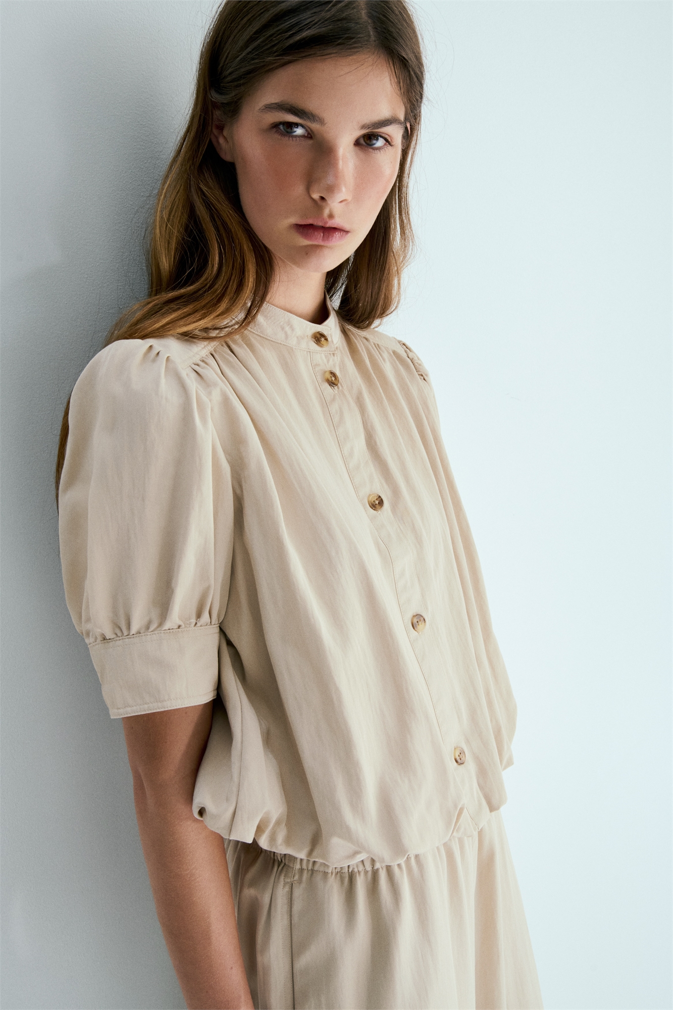Блузка из мягкого твила с воротником-стойкой и пуговицами спереди. Плечевые швы, смещенные вперед, сборка на спине и короткие рукава-буфы с манжетами на пуговицах. Асимметричный подол для пышного силуэта.