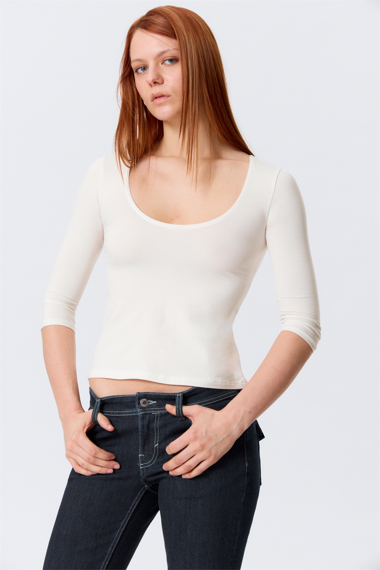 Приталенный топ из эластичного хлопкового джерси, приятного на ощупь. Модель с широким вырезом и рукавами длиной три четверти.