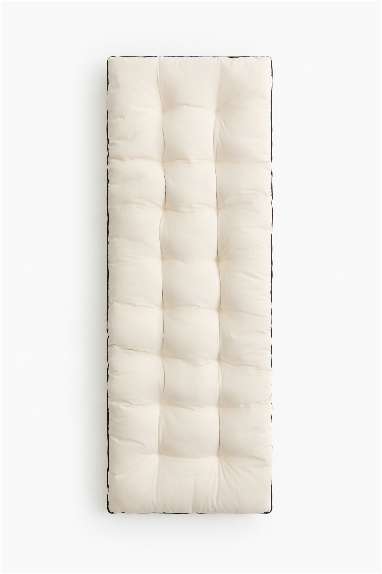 Большая мягкая подушка для сиденья из водоотталкивающего хлопчатобумажного полотна с стегаными узелками и кантом по краям. Идеально подходит для скамейки или кушетки и может использоваться на открытом воздухе.