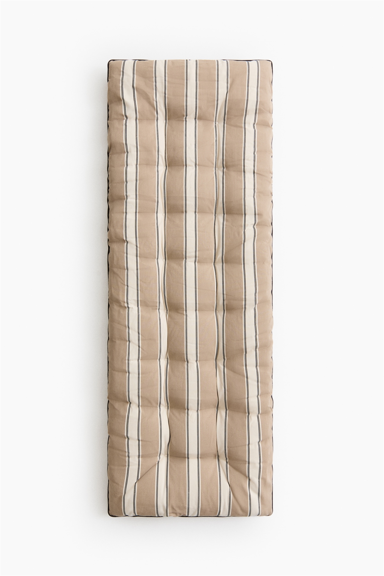 Большая мягкая подушка для сиденья из водоотталкивающего хлопчатобумажного полотна с стегаными узелками и кантом по краям. Идеально подходит для скамейки или кушетки и может использоваться на открытом воздухе.