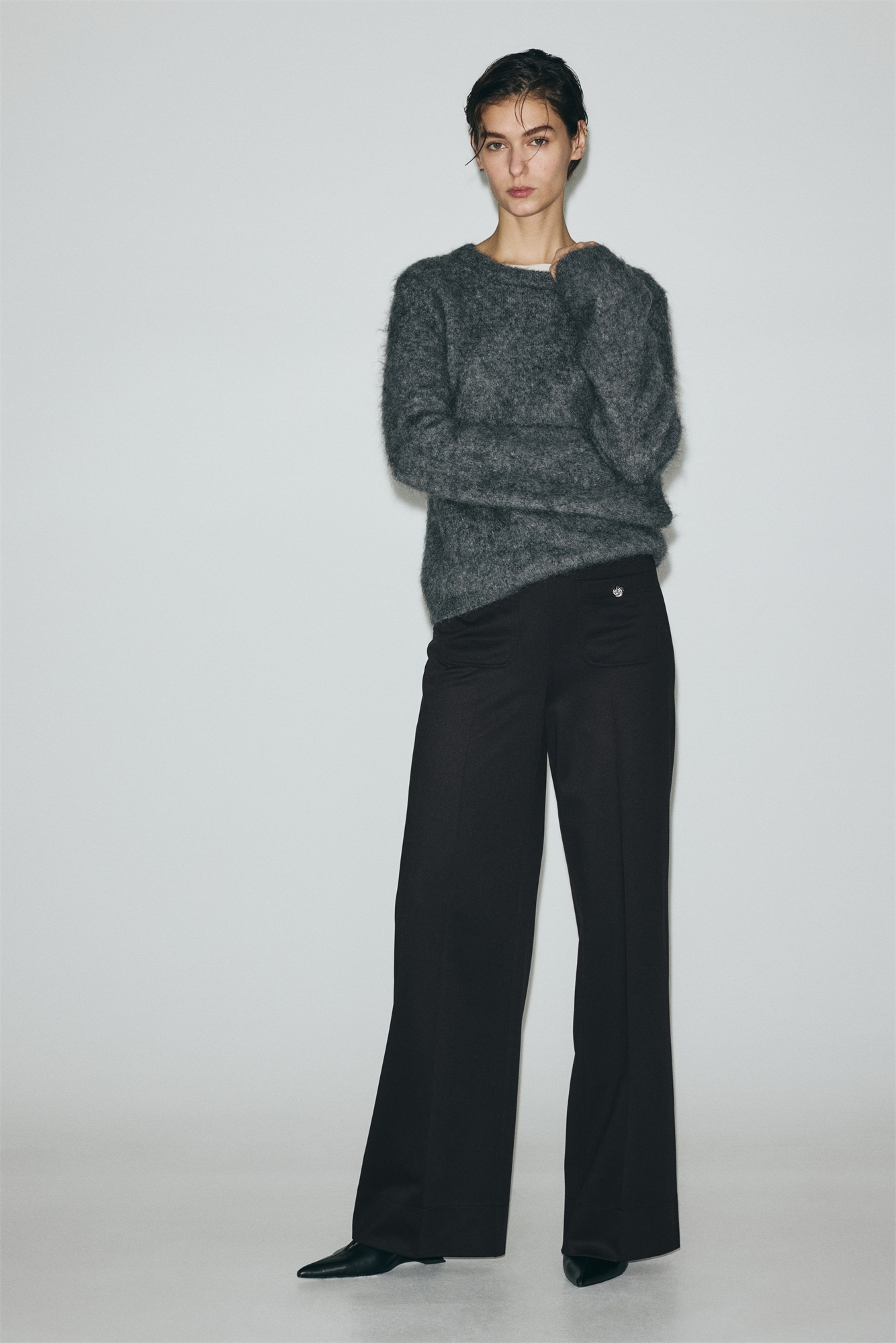 Брюки из тканого материала с высокой талией, скрытой резинкой и накладными карманами спереди с пуговицами. Прямые брючины с заутюженными складками спереди.