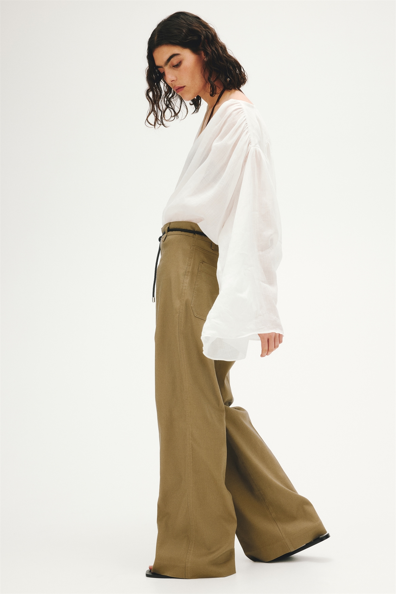 Брюки приталенного кроя из твила, изготовленные из смеси льна, вискозы и хлопка. Высокая талия с плетеным поясом-завязкой и застежкой-молнией с потайной пуговицей и крючком-застежкой. Накладные задние карманы и брючины с расклешенными штанинами и складками спереди и сзади.