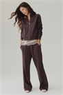 Свободные брюки из плотного трикотажа с легким блеском. Потайная резинка на талии, диагональные боковые карманы и прямые ноги с застроченными складками спереди.