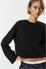 Короткий топ из трикотажа интерлок с круглым вырезом с ребристой отделкой, слегка спущенными плечами и длинными рукавами.