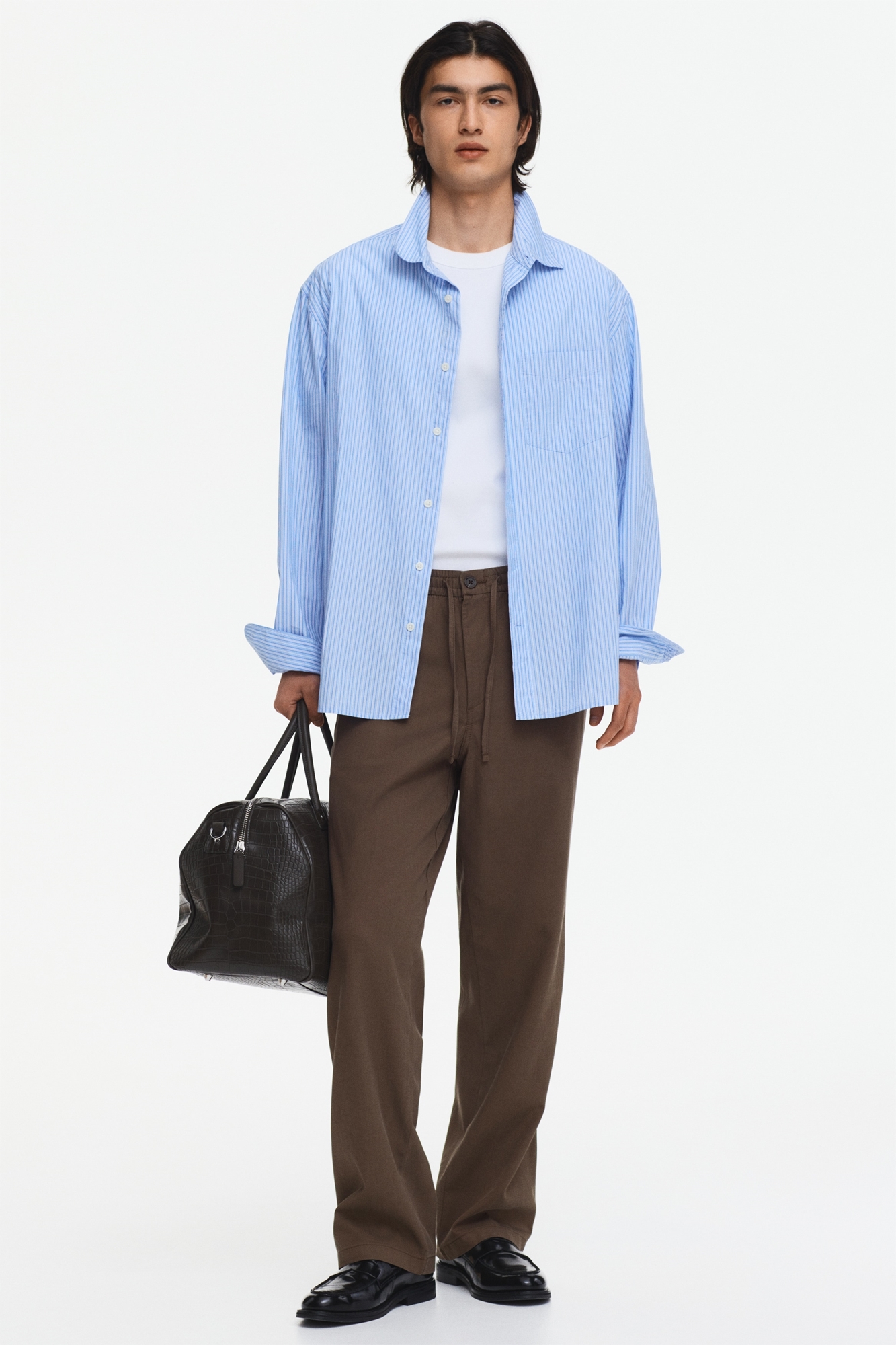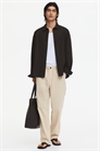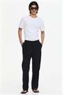 Брюки из твила, изготовленные из смеси хлопка и лиоцелла. Пояс с скрытой резинкой и шнурком, застежка-молния с пуговицей, диагональные боковые карманы и накладной задний карман. Свободный крой, создающий непринужденный, но не слишком объемный силуэт.
