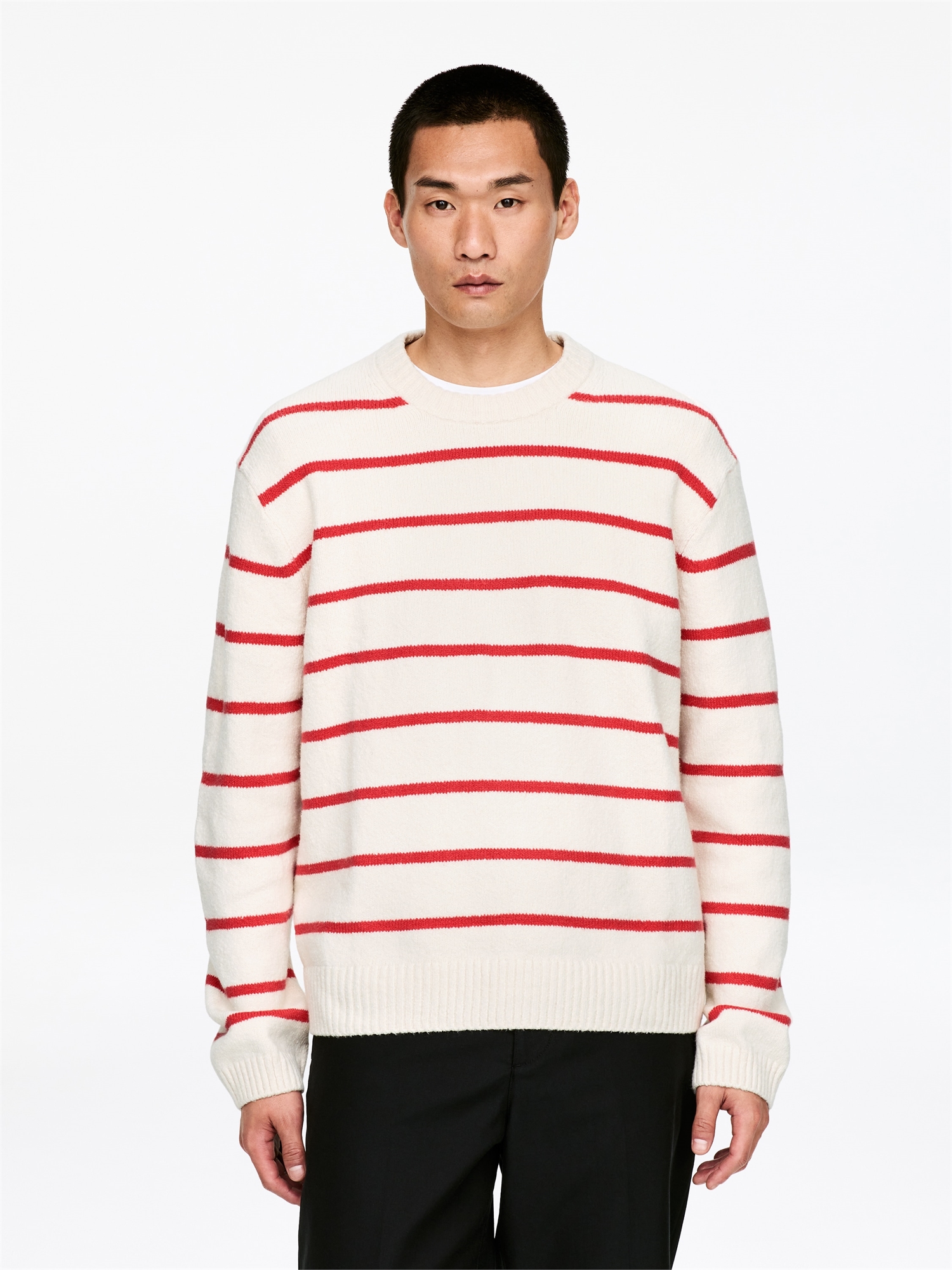 Этот джемпер из хлопковой смеси с гладкой вязкой имеет узор из окрашенных в пряжу полос. Модель с круглым вырезом и свободным кроем с заниженными плечами. Отделка из ребристой вязки на вырезе, манжетах и подоле.