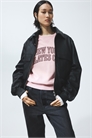 Топ оверсайз из толстовочной ткани с мягкой начесом внутри и деталью из мотивов спереди. Круглый вырез с ребристой отделкой, спущенные плечи и длинные рукава. Ребристые манжеты и подол.