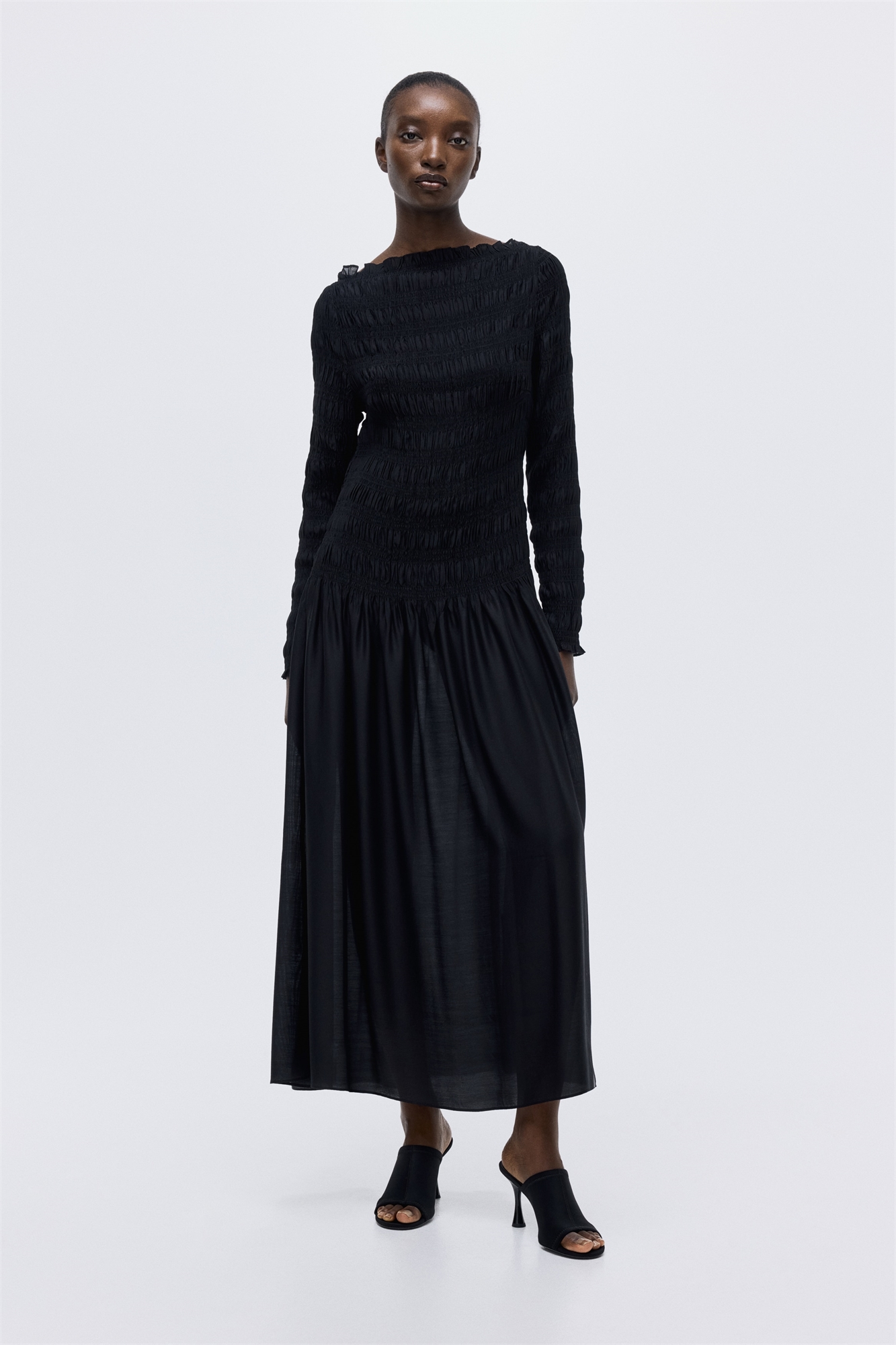 Платье длиной до щиколоток из тканого вискозного микса с приталенным лифом и длинными рукавами с плавками. Вырез-лодочка с отделкой оборками, сборки на бедрах и расклешенная юбка. Без подкладки.
