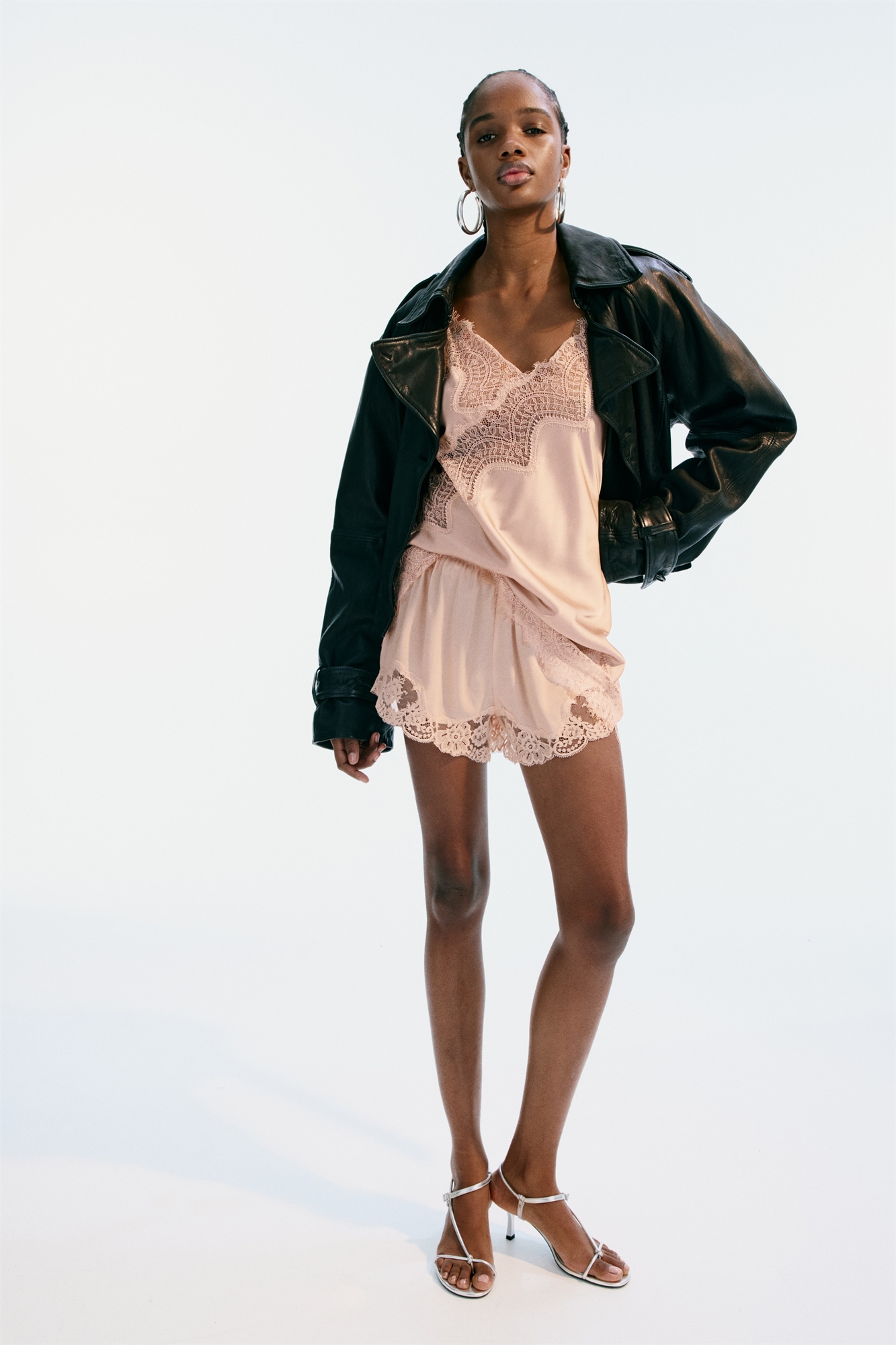 Длинный топ из мягко ниспадающего атласа с V-образным вырезом, украшенным широкой кружевной окантовкой с волнистым краем, которая диагонально спускается по передней части. Регулируемые тоненькие бретели и асимметричный подол с широкой кружевной окантовкой с волнистым краем.