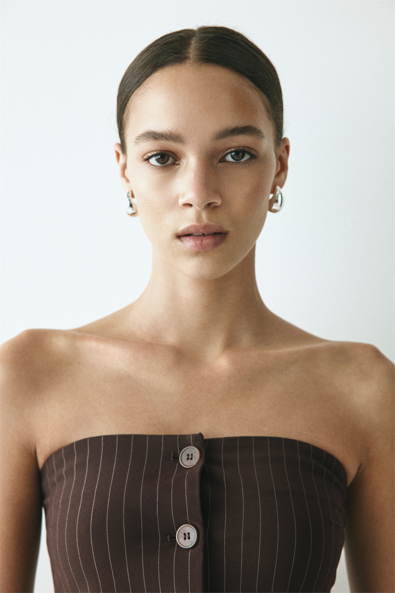Жилет-бандо из плотного джерси с пуговицами спереди и скрытой силиконовой окантовкой по верхнему краю.