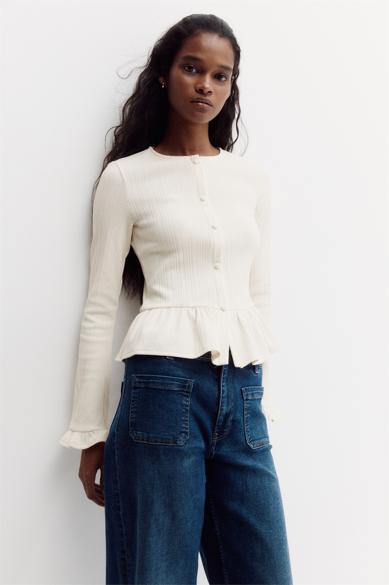 Приталенный кардиган из тонкого трикотажа в рубчик с круглым вырезом и закрытыми пуговицами до талии. Длинные рукава с манжетами с оборками и сборкой на талии, создающей расклешенный пеплум.