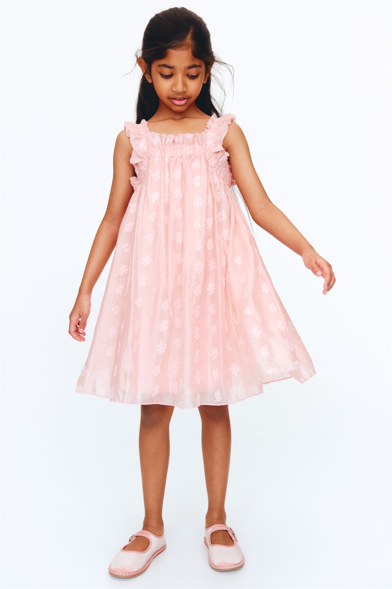 Платье А-силуэта из жаккардового полотна с цветочным узором и легким блеском, с подкладкой из тюля для создания объемного силуэта. Эластичные бретели с оборками и прямой верх с оборками и скрытой резинкой.