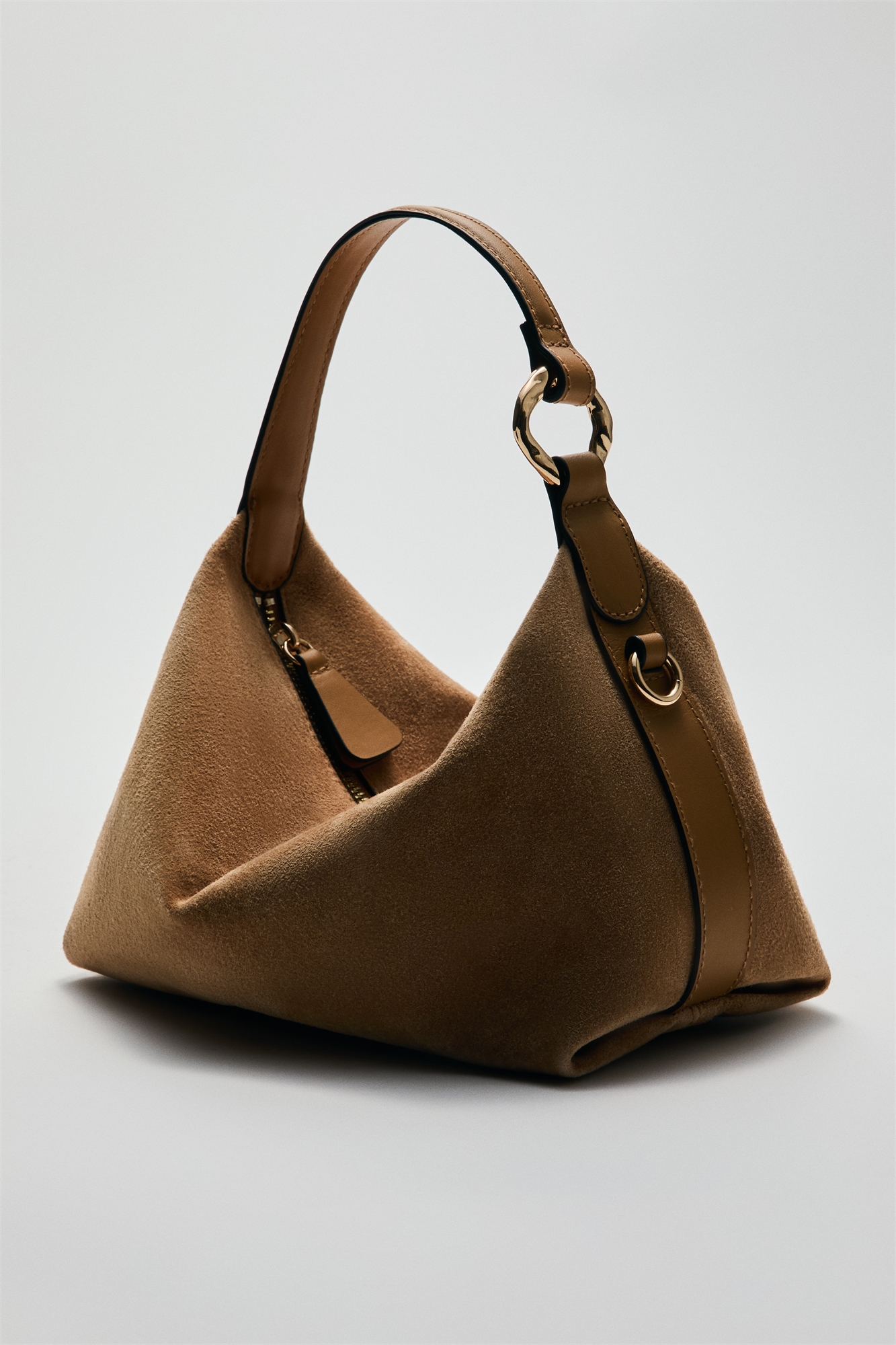 Сумка через плечо из мягкой замши с кожаными деталями. Имеет застежку-молнию в верхней части, ручку с металлическим кольцом органичной формы и съемный плечевой ремень. Внутреннее отделение на молнии. На подкладке.