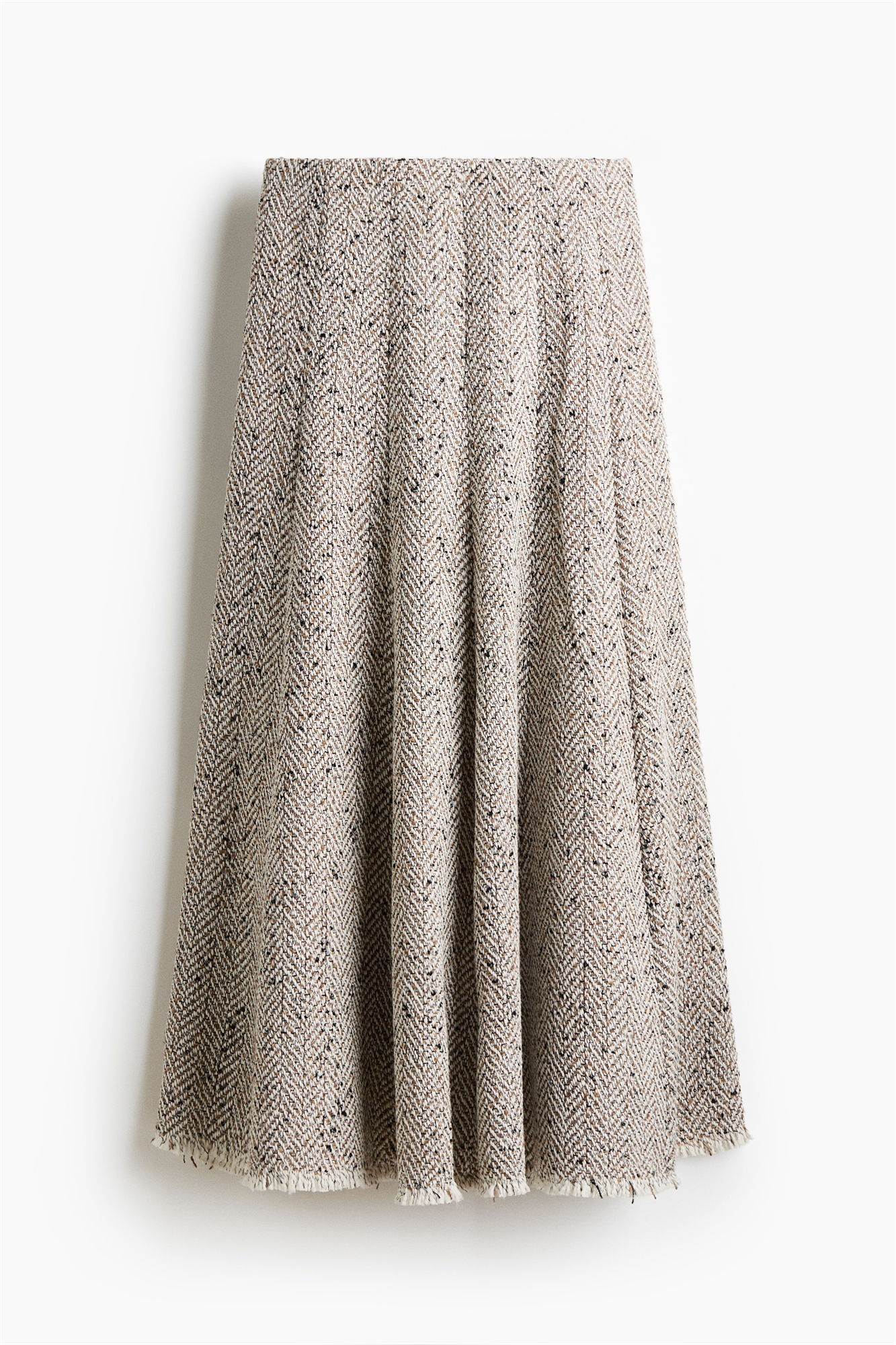 Расклешенная юбка длиной до щиколоток из переплетения в елочку с начесом. Заниженная талия, потайная застежка на молнию и крючок с глазом с одной стороны, обтрепанный подол. На подкладке.