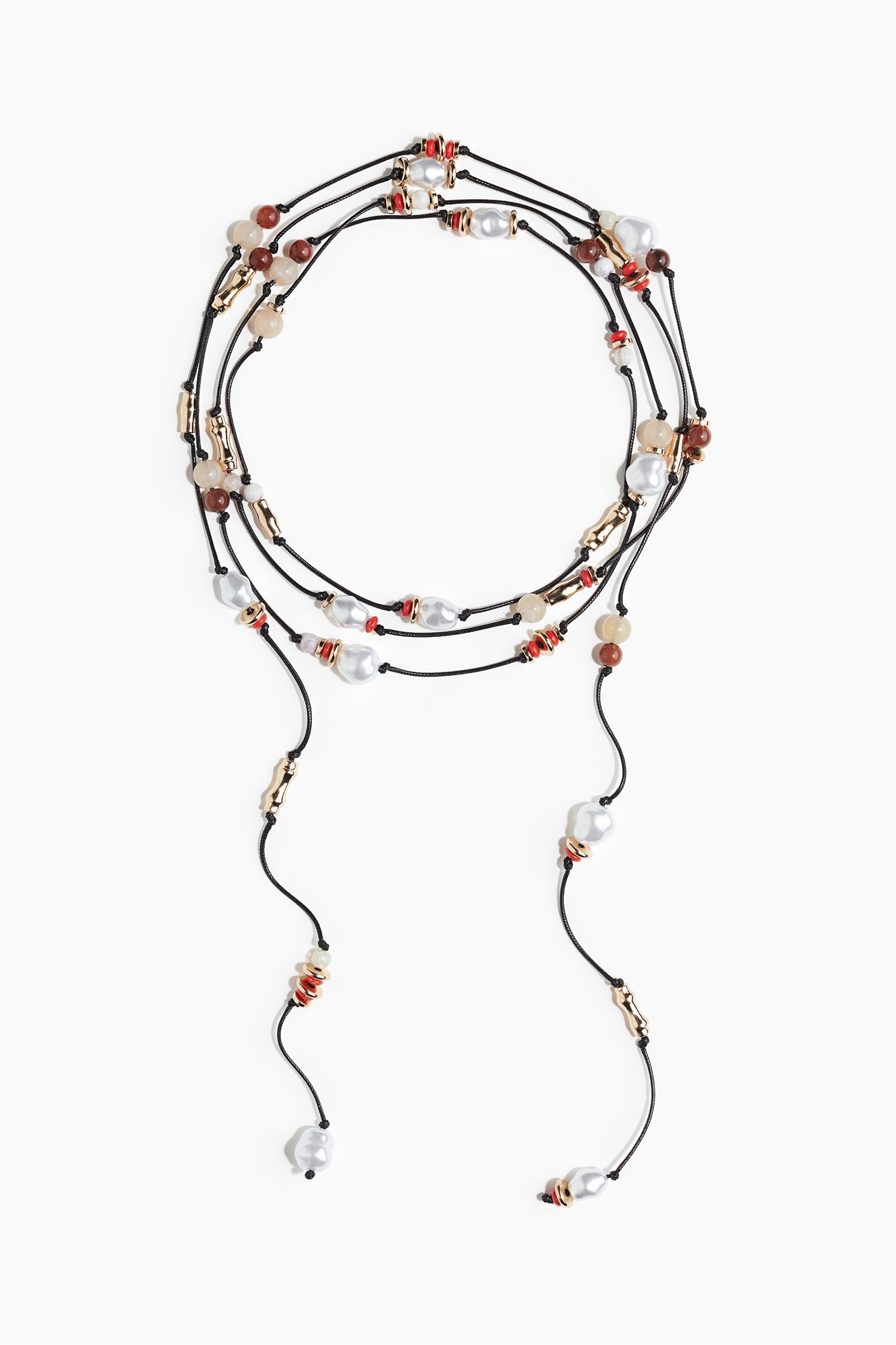 Ожерелье из длинного шнура с узелками, украшенное пластиковыми бусинами разных форм и цветов.