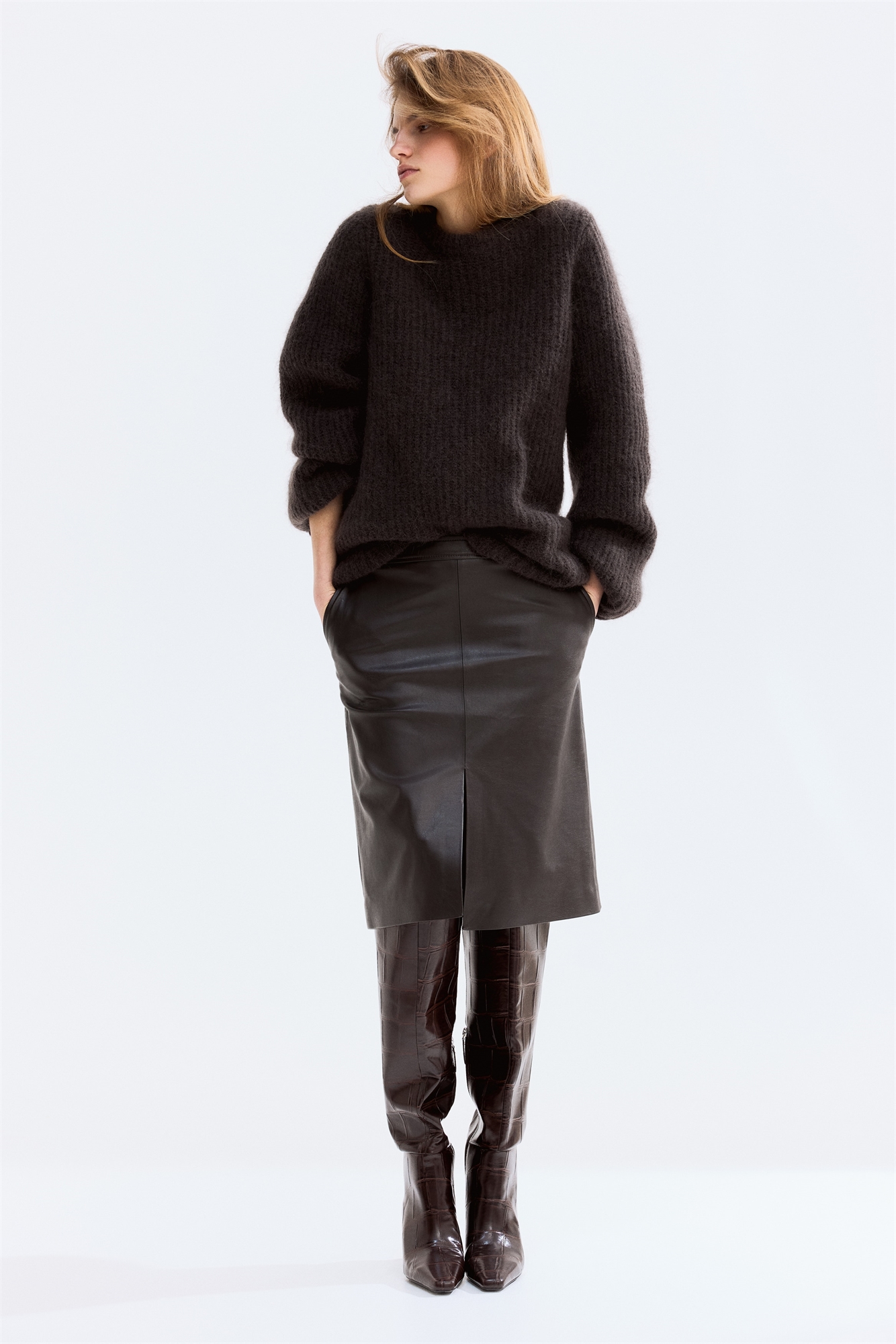 Юбка длиной до колена из мелованной ткани с высокой талией, потайной застежкой-молнией и застежкой-крючком сзади. Диагональные боковые карманы и прямой подол с разрезом спереди. На подкладке.