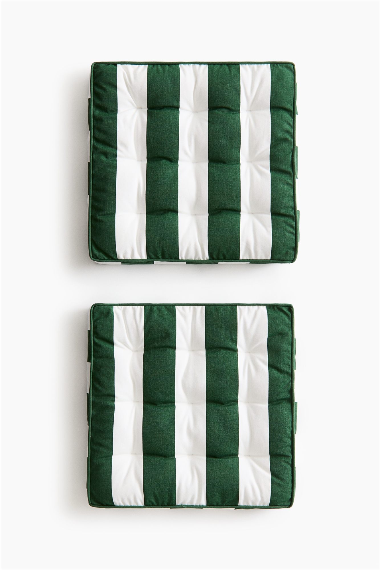 Пара мягких подушек для сидений из водоотталкивающей хлопчатобумажной ткани, подходящих для использования на открытом воздухе. Исполнены в классическом полосатом дизайне, с окантовкой по краям и стегаными узелками. Боковая ручка для удобной переноски. Хранение подушек в помещении в период неиспользования поможет сохранить их в хорошем состоянии.