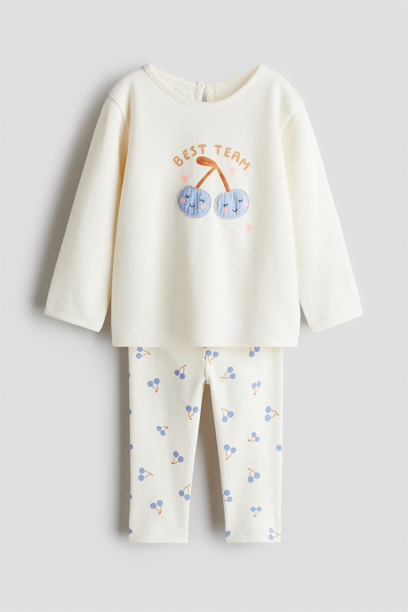 Комплект из топа из легкой толстовочной ткани и леггинсов из мягкого ребристого джерси, оба из хлопка. Топ с длинными рукавами, круглым вырезом, отверстием для ключа с пуговицей сзади на шее и аппликацией спереди. Леггинсы с мягкой эластичной резинкой на талии.