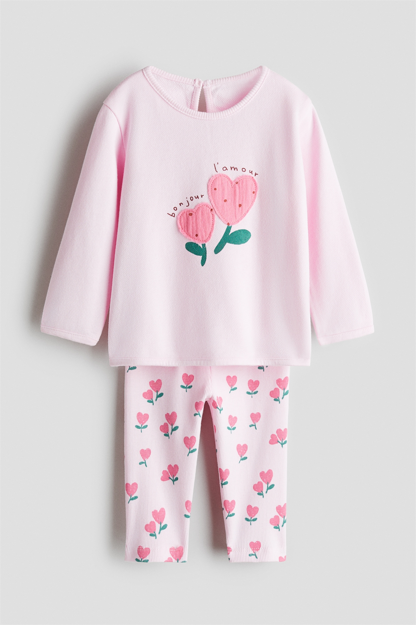 Комплект из топа из легкой толстовочной ткани и леггинсов из мягкого ребристого джерси, оба из хлопка. Топ с длинными рукавами, круглым вырезом, отверстием для ключа с пуговицей сзади на шее и аппликацией спереди. Леггинсы с мягкой эластичной резинкой на талии.