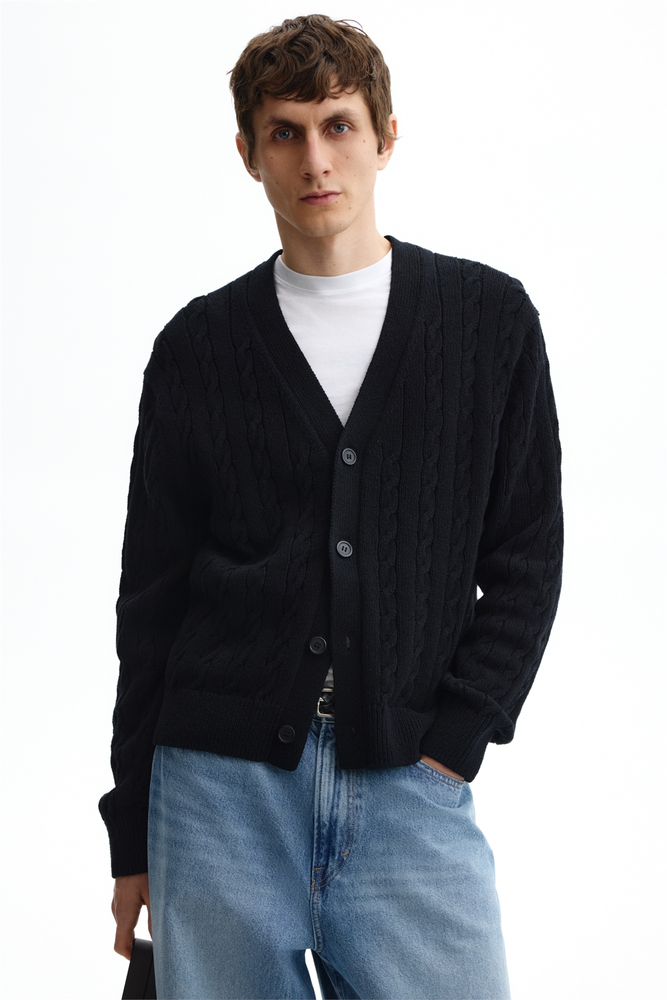 Кардиган из хлопка с узором «коса», глубоким V-образным вырезом, пуговицами спереди и длинными рукавами. Резинка вокруг выреза, по линии пуговиц, на манжетах и по низу. Свободный крой для повседневного, но не слишком объемного силуэта.