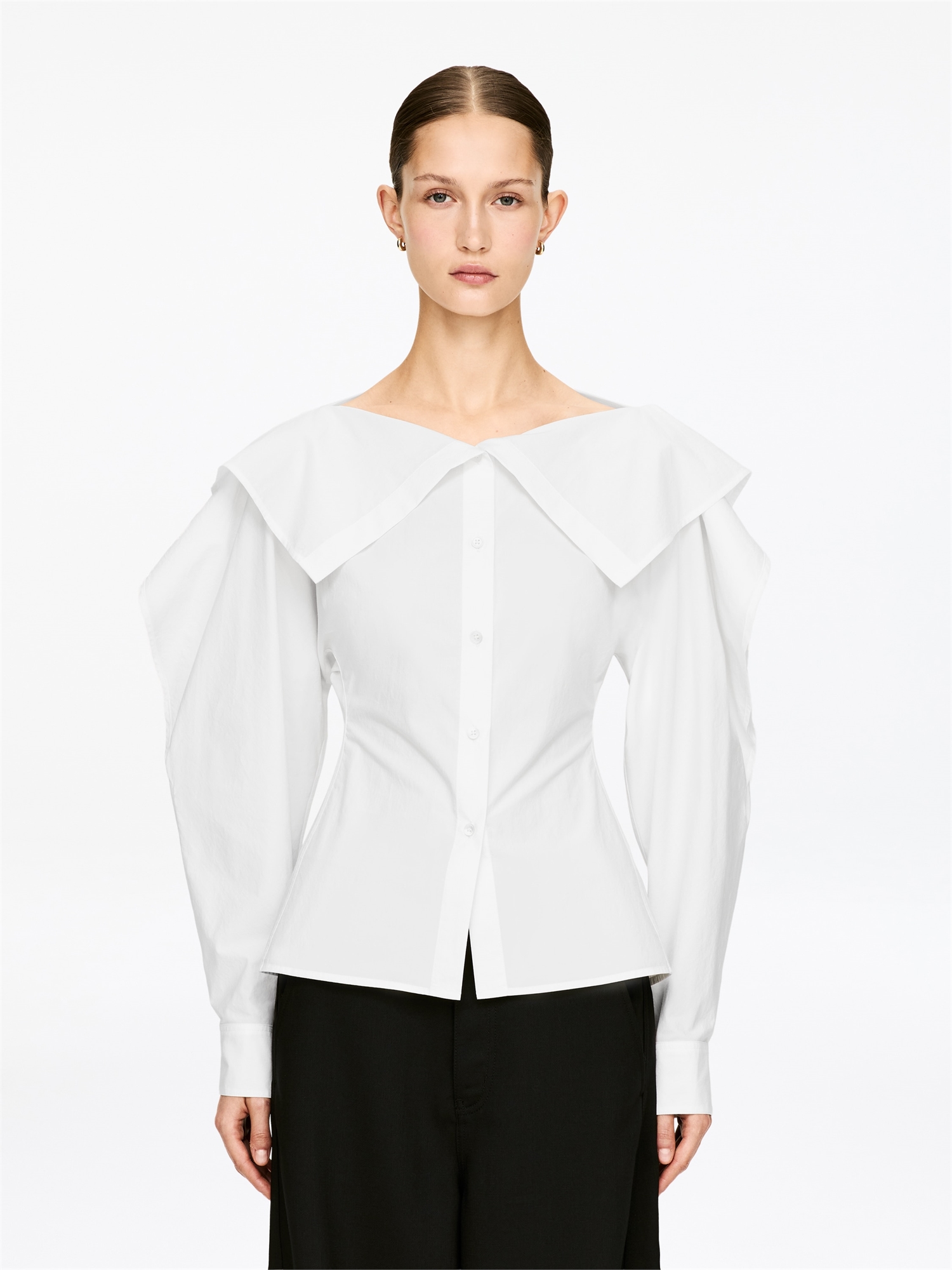 Эта приталенная блузка из хрустящего хлопка с открытым отложным воротником и рукавами "летучая мышь" создает непринужденный, но изысканный силуэт.