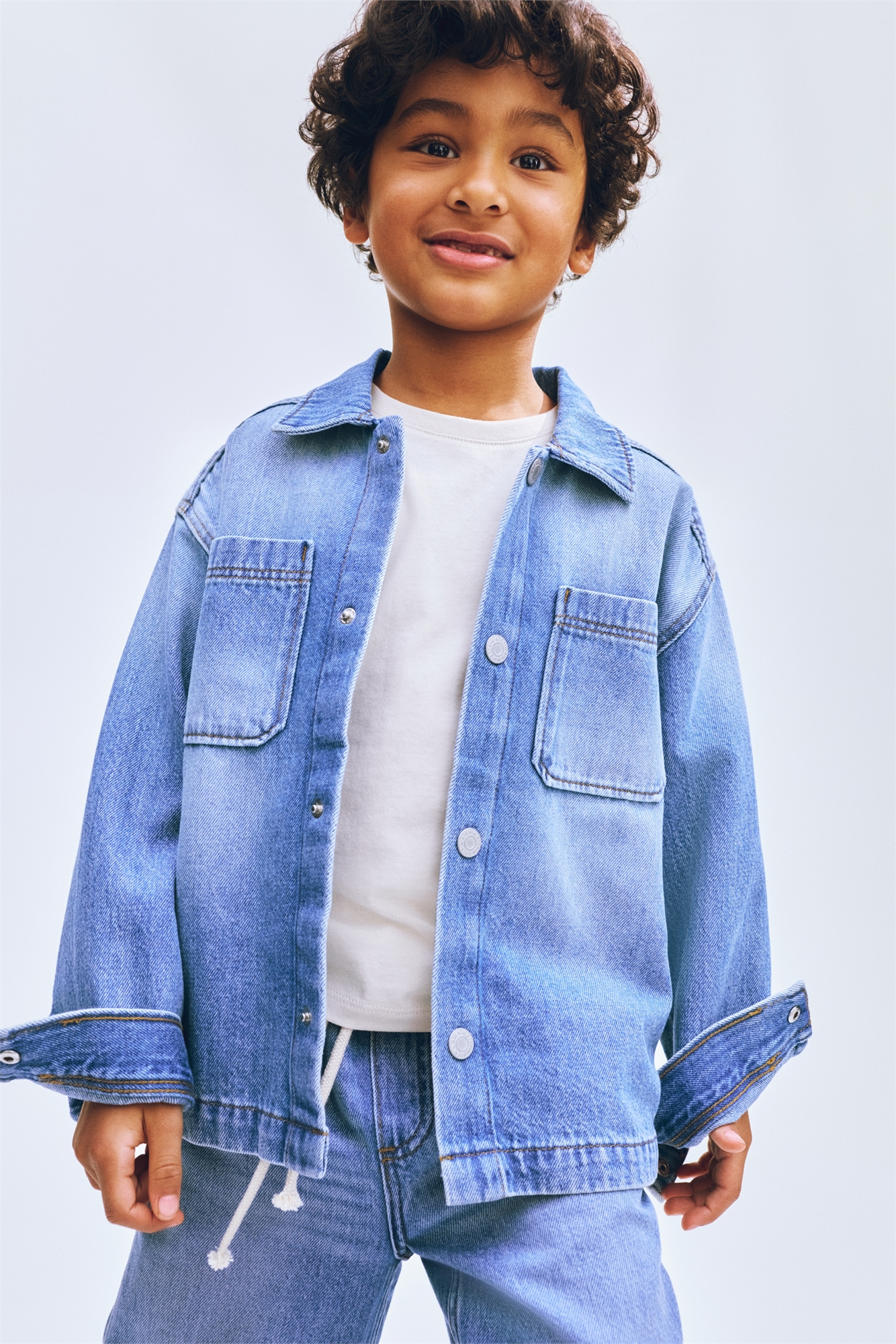 Оверсайз-рубашка из хлопкового денима с воротником, застежкой на кнопках спереди, кокеткой сзади и накладными карманами на груди. Опущенные плечи и длинные рукава с застежкой на кнопках на манжетах.